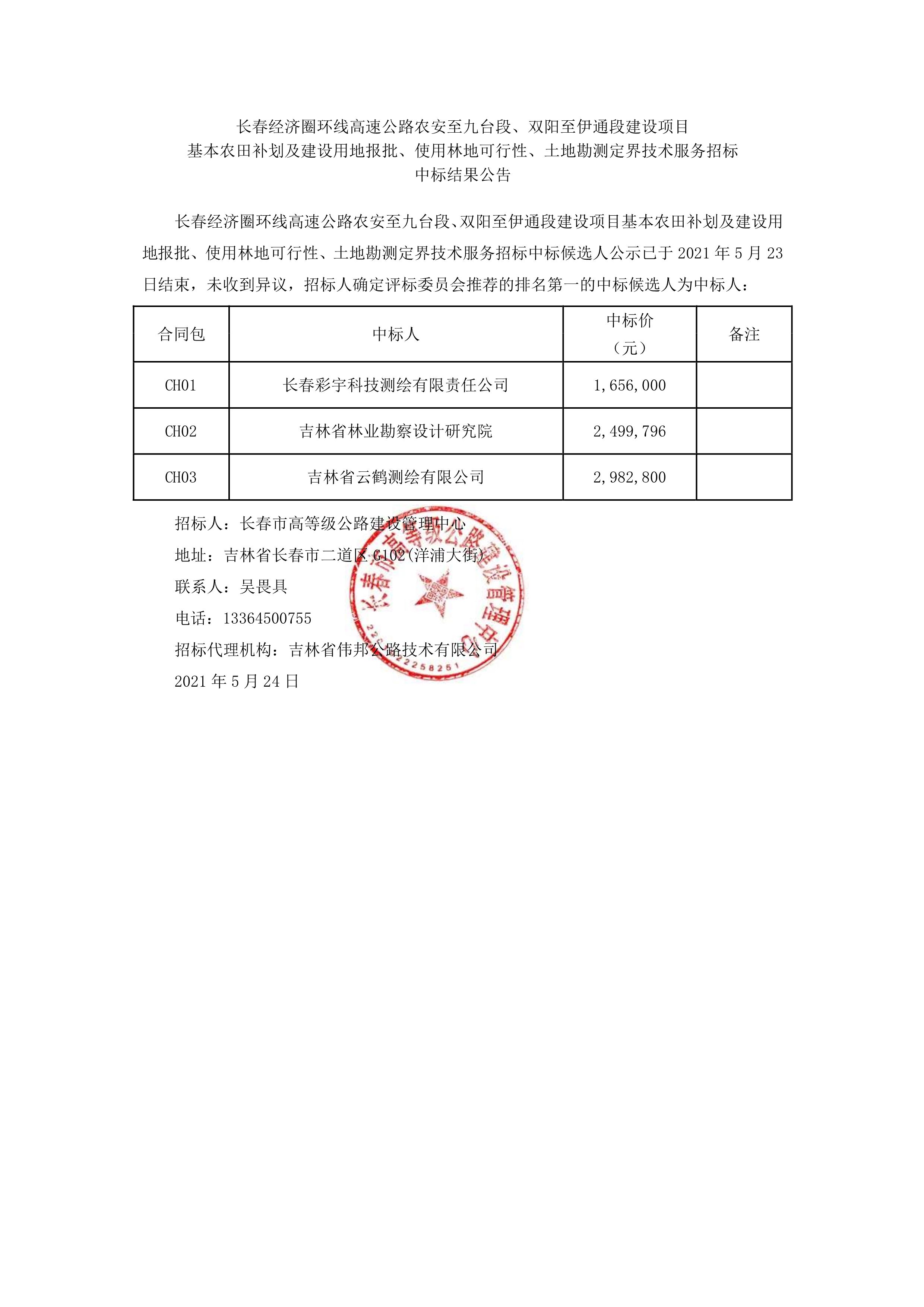长春经济圈环线高速公路农安至九台段、双阳至伊通段建设项目基本农田补划及建设用地报批、使用林地可行性、土地勘测定界技术服务招标中标结果公告