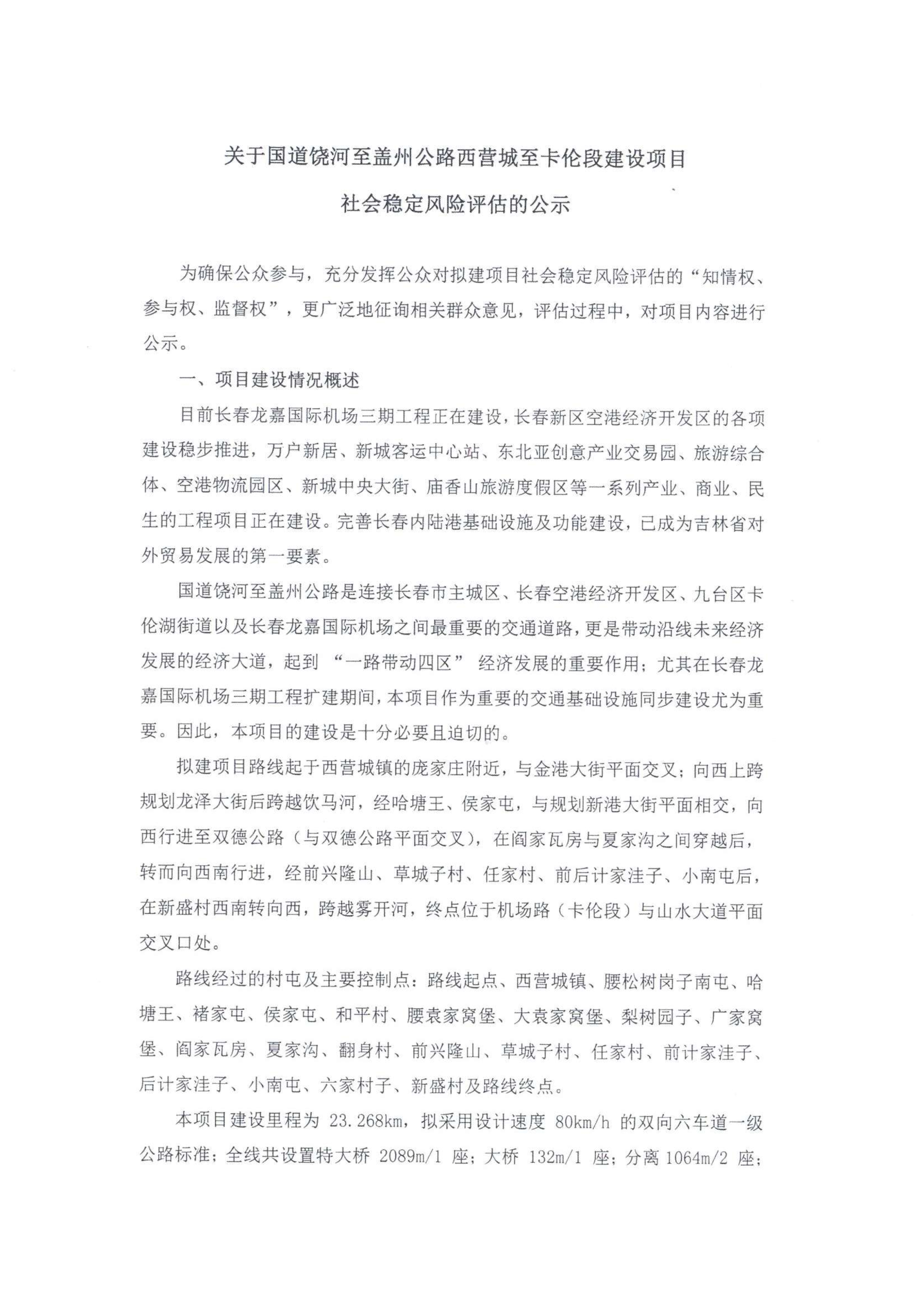 关于国道饶河至盖州公路西营城至卡伦段建设项目社会稳定风险评估的公示