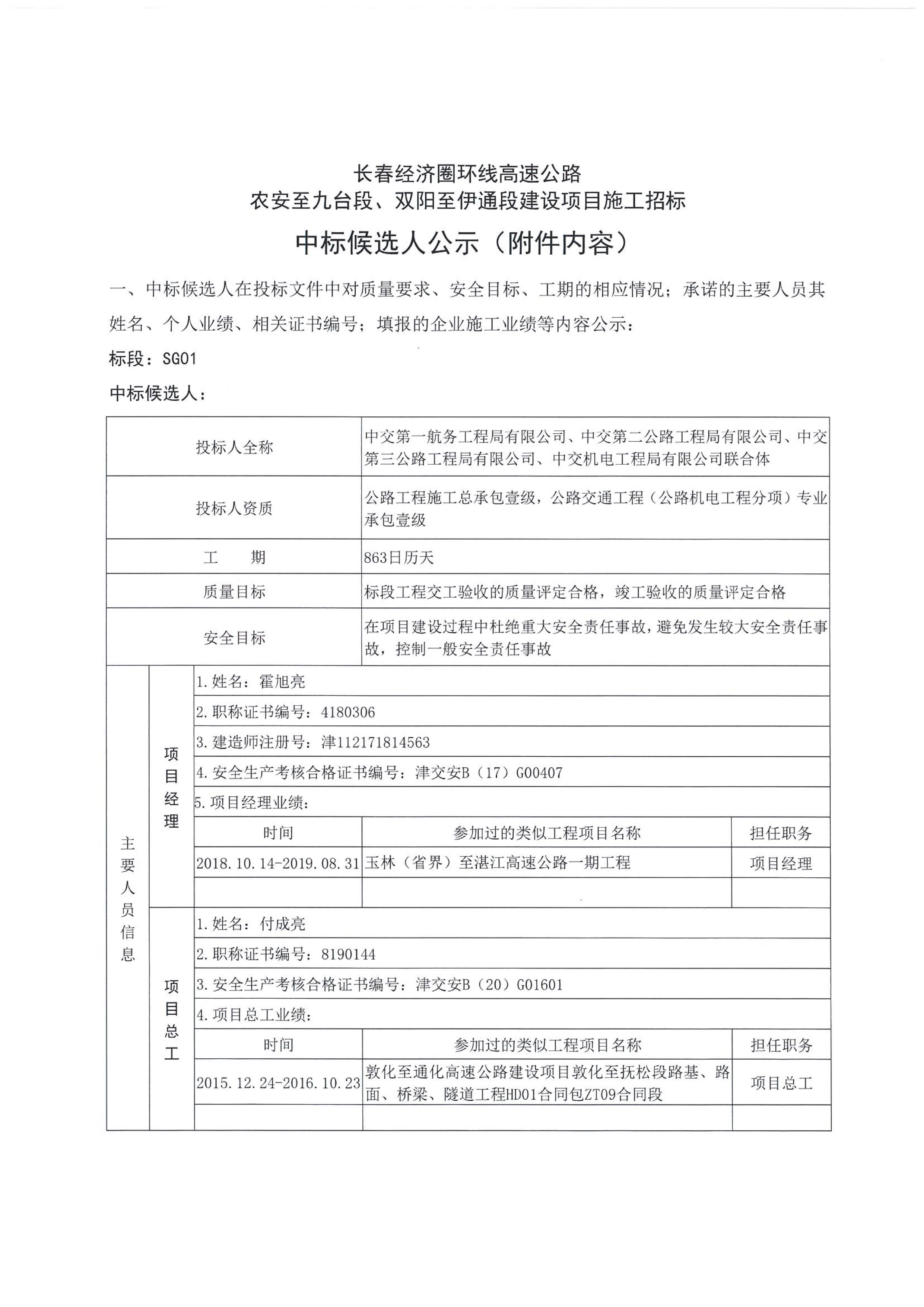 长春经济圈环线高速公路农安至九台段、双阳至伊通段建设项目施工招标中标候选人公示