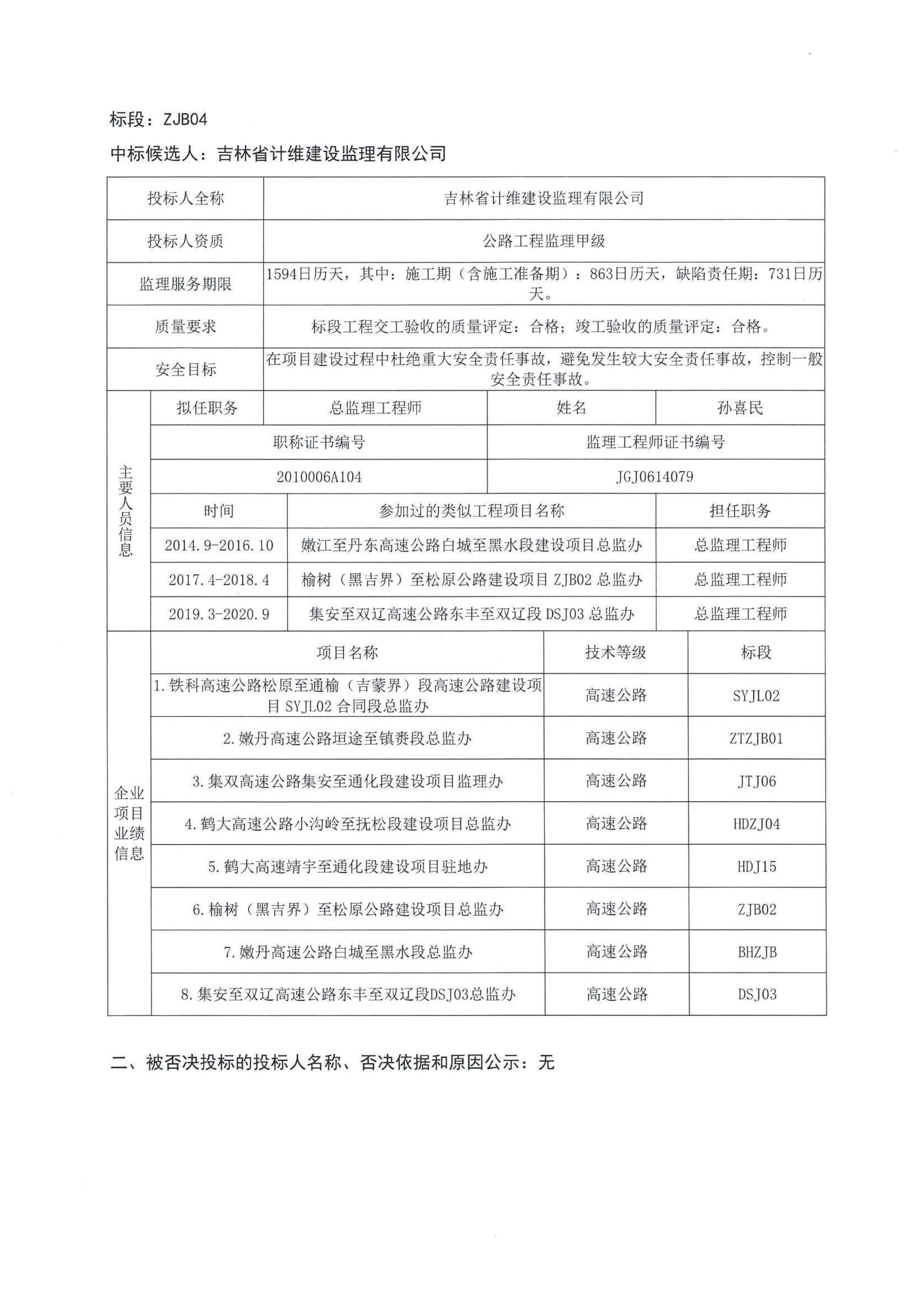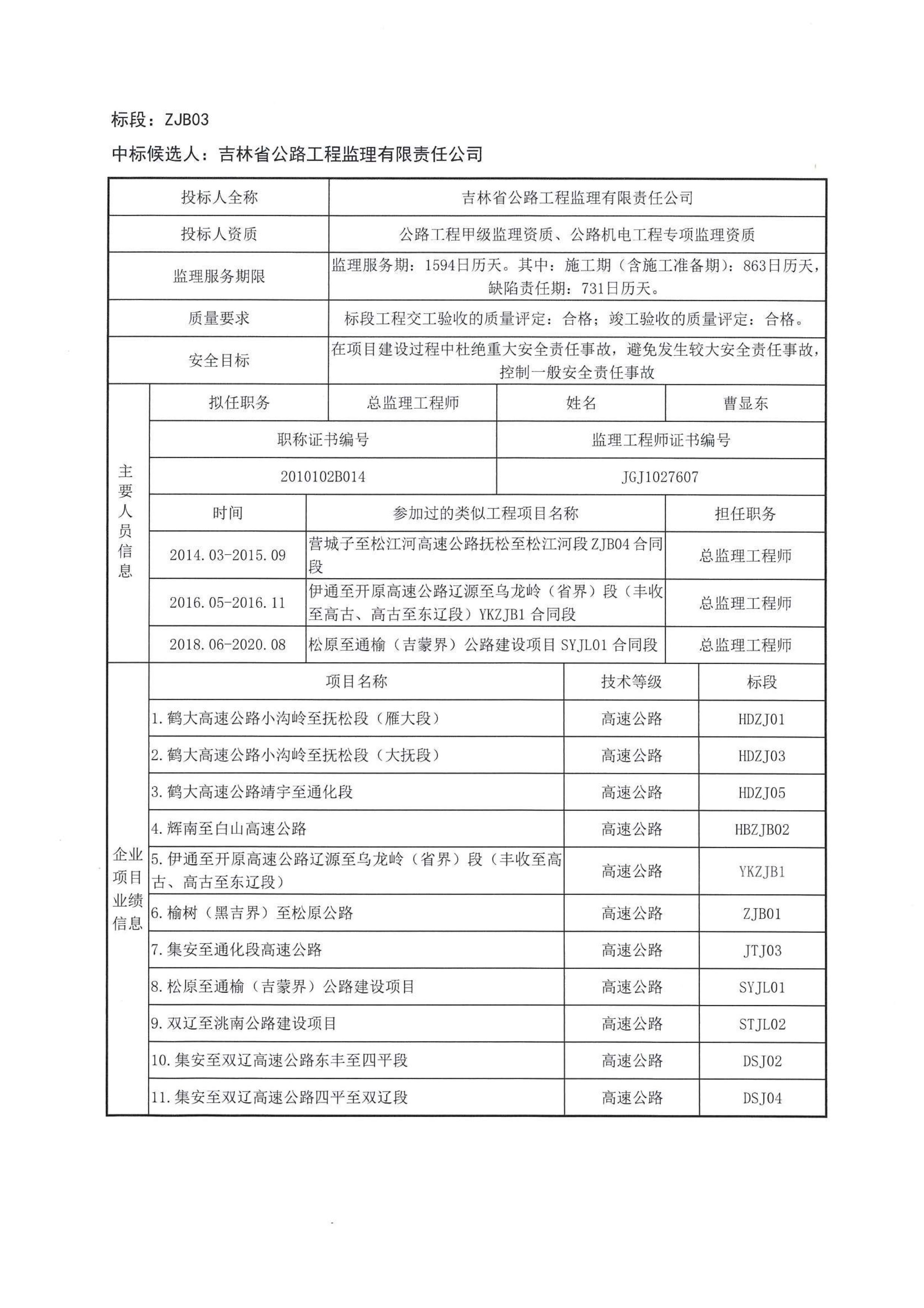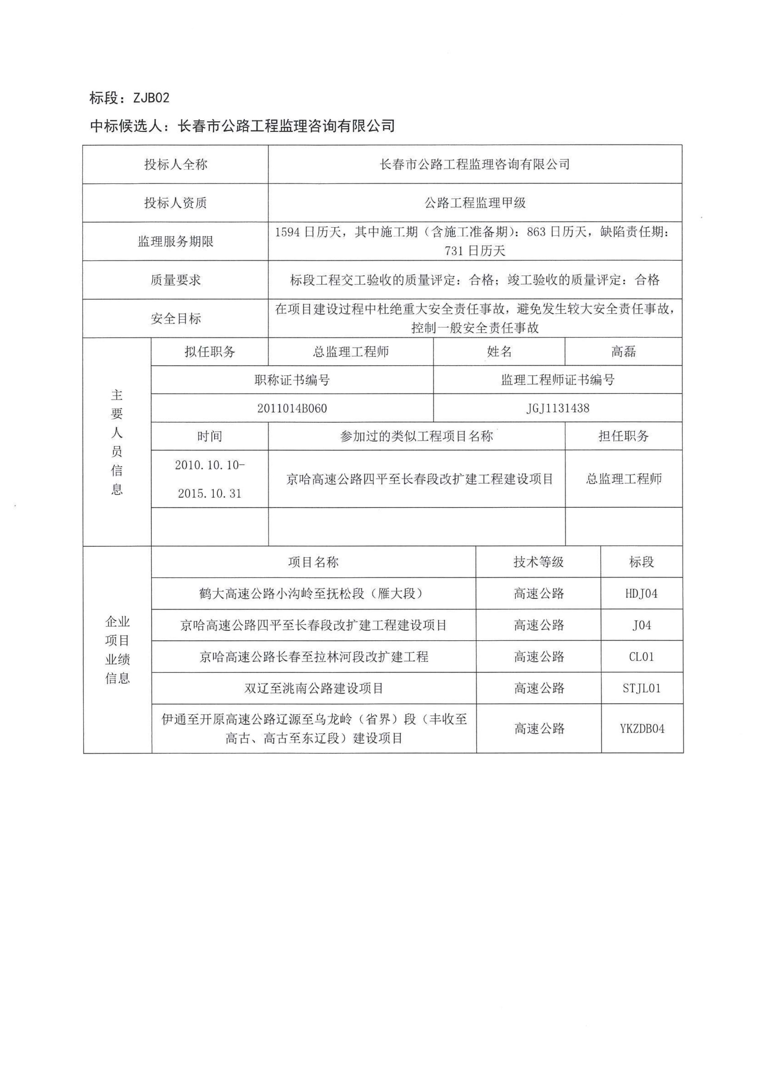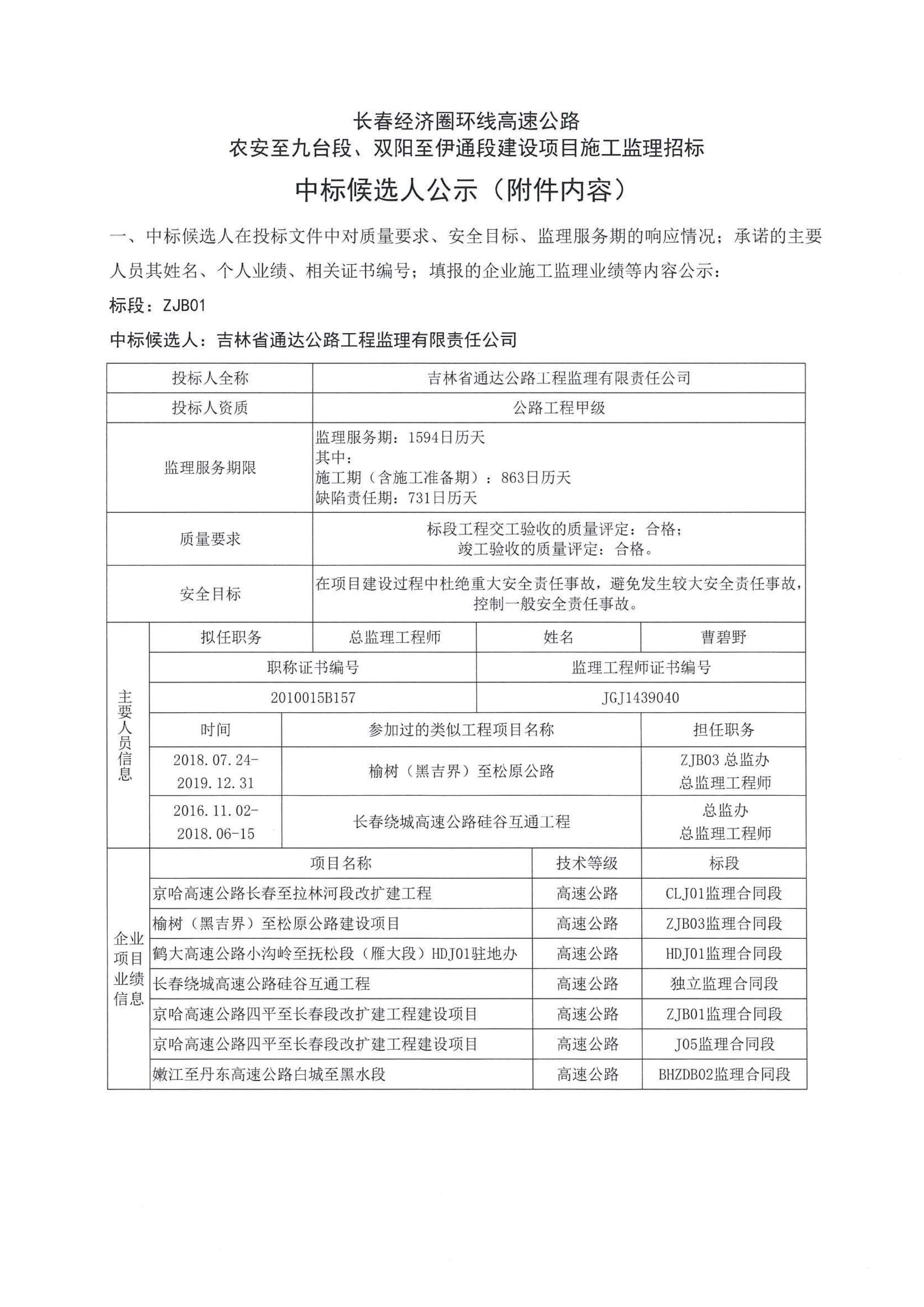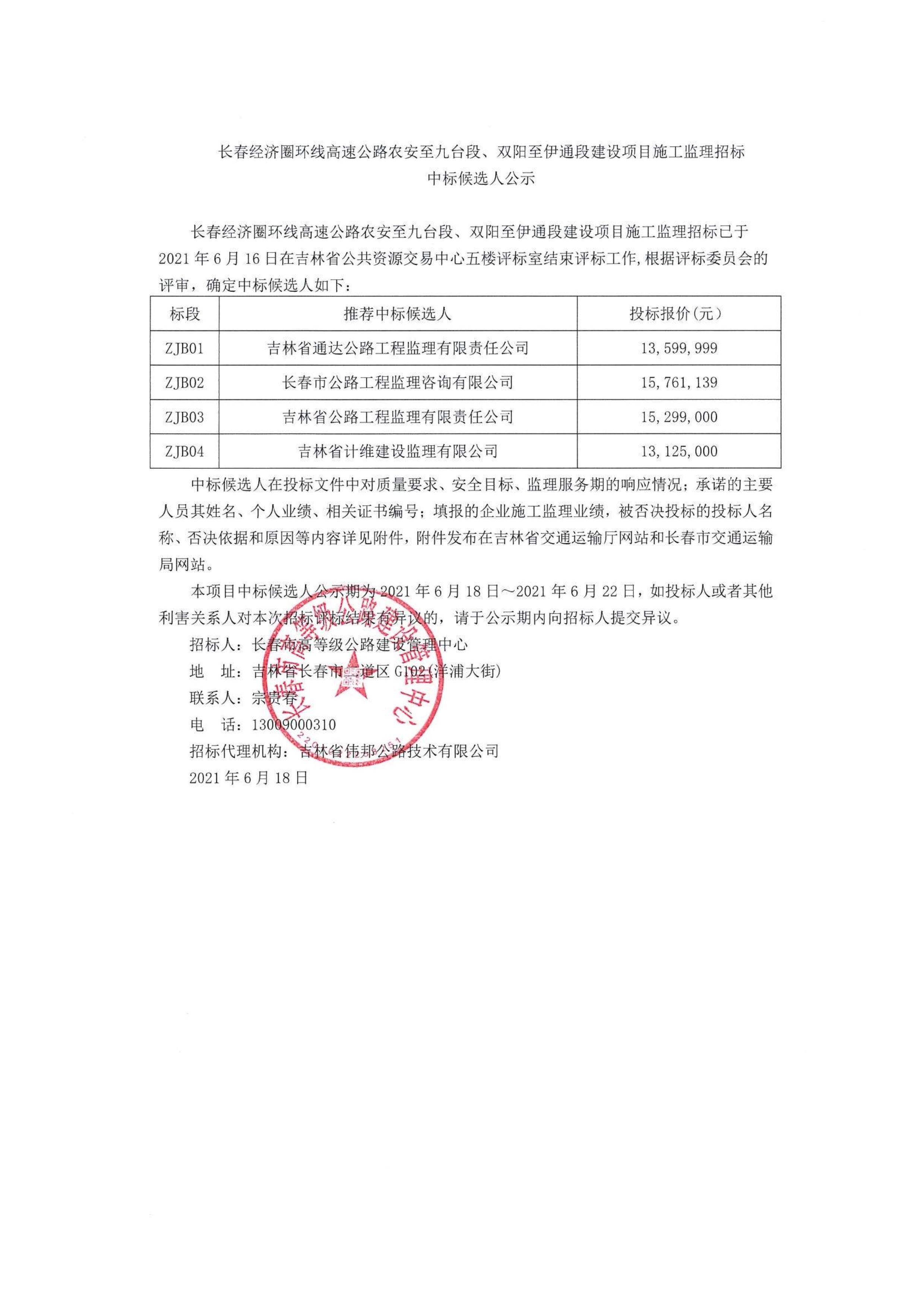 长春经济圈环线高速公路农安至九台段、双阳至伊通段建设项目施工监理招标中标候选人公示