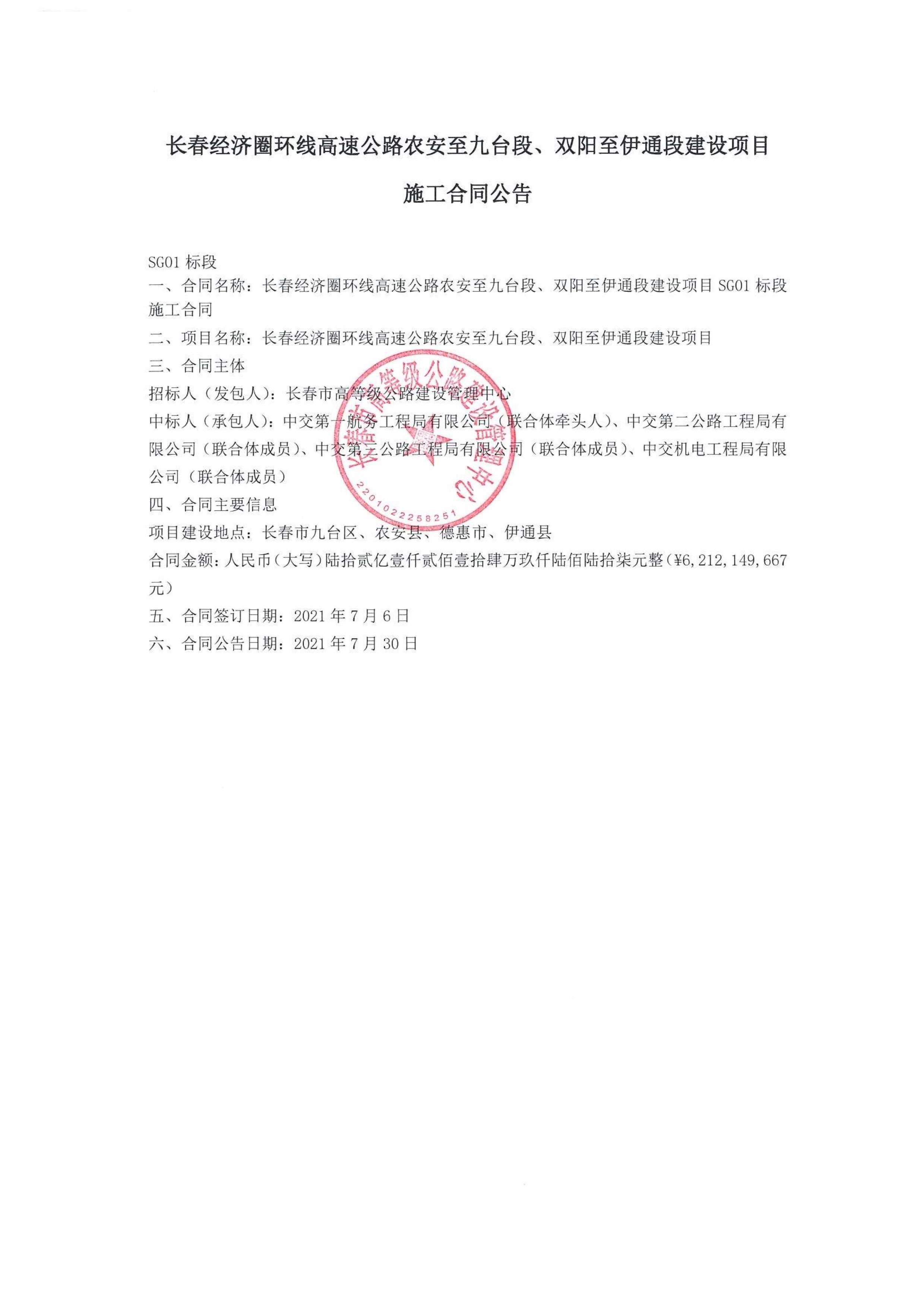 长春经济圈环线高速公路农安至九台段双阳至伊通段建设项目施工合同公告