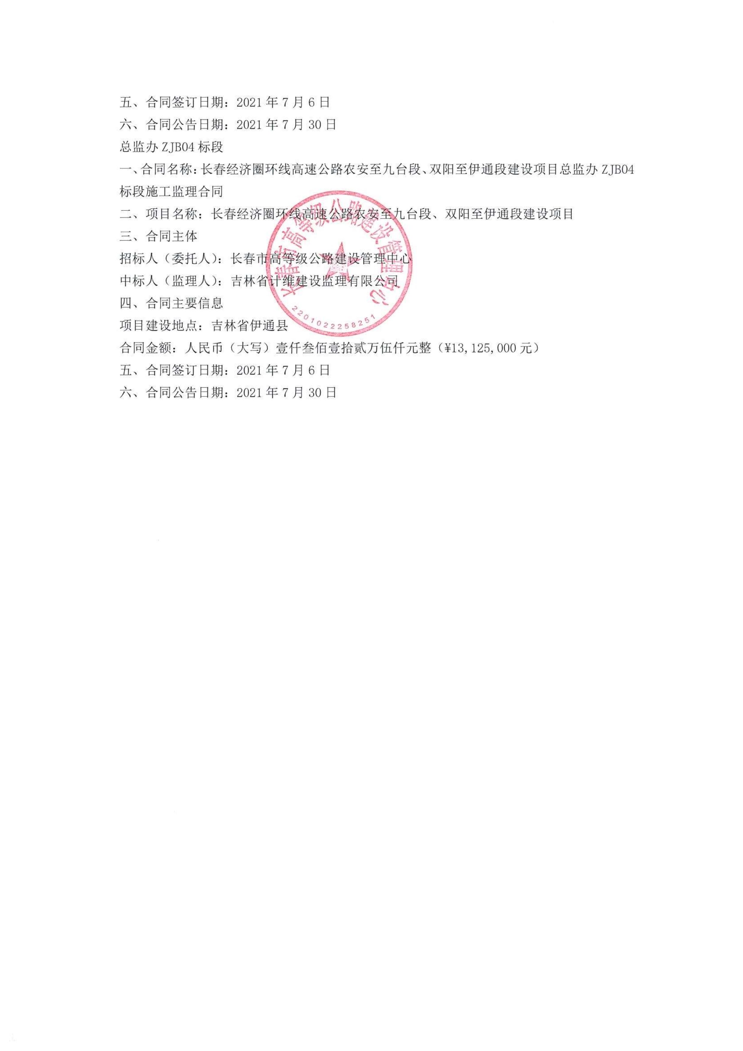长春经济圈环线高速公路农安至九台段双阳至伊通段建设项目施工监理合同公告