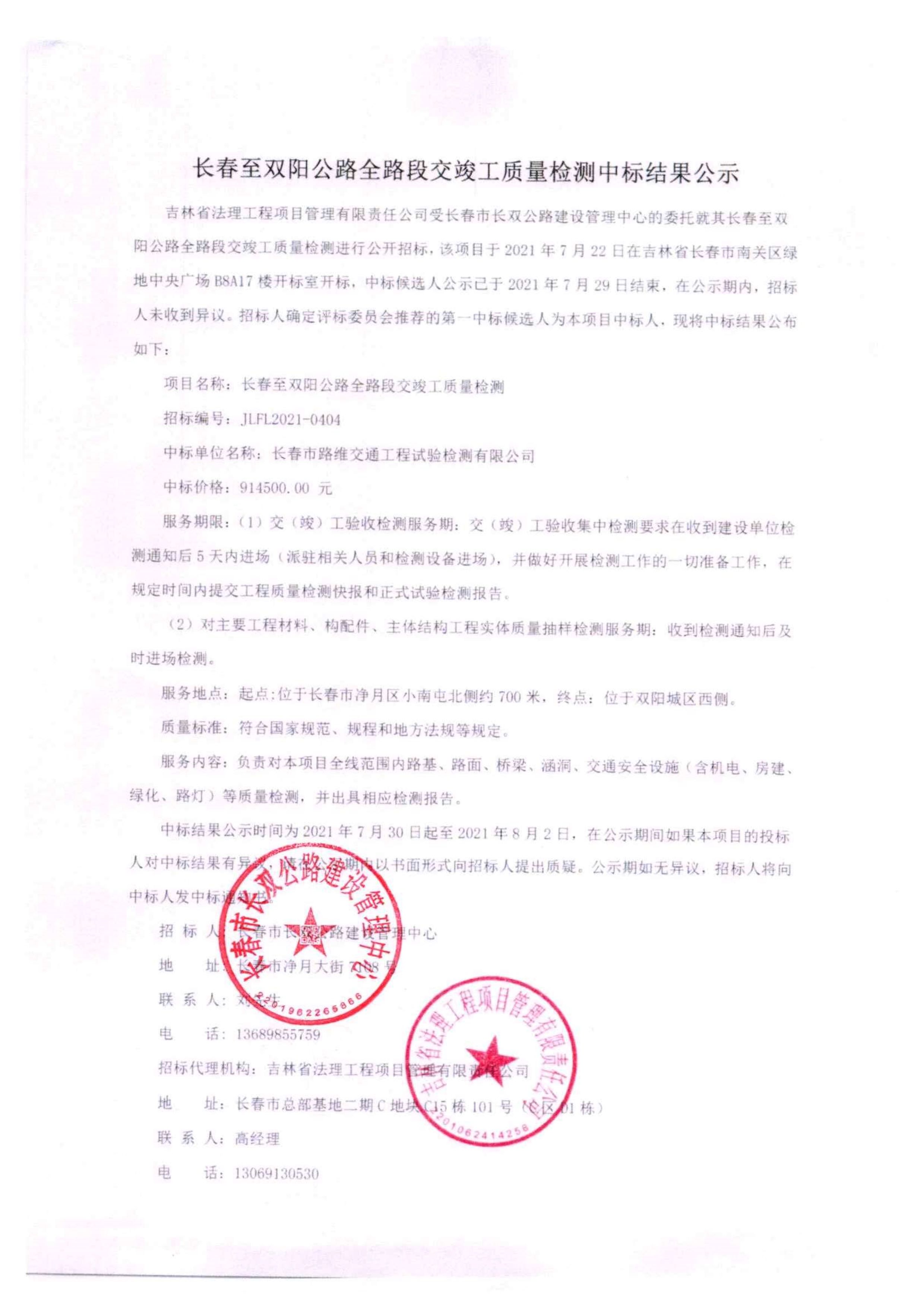 长春至双阳公路全路段交竣工质量检测中标结果公示