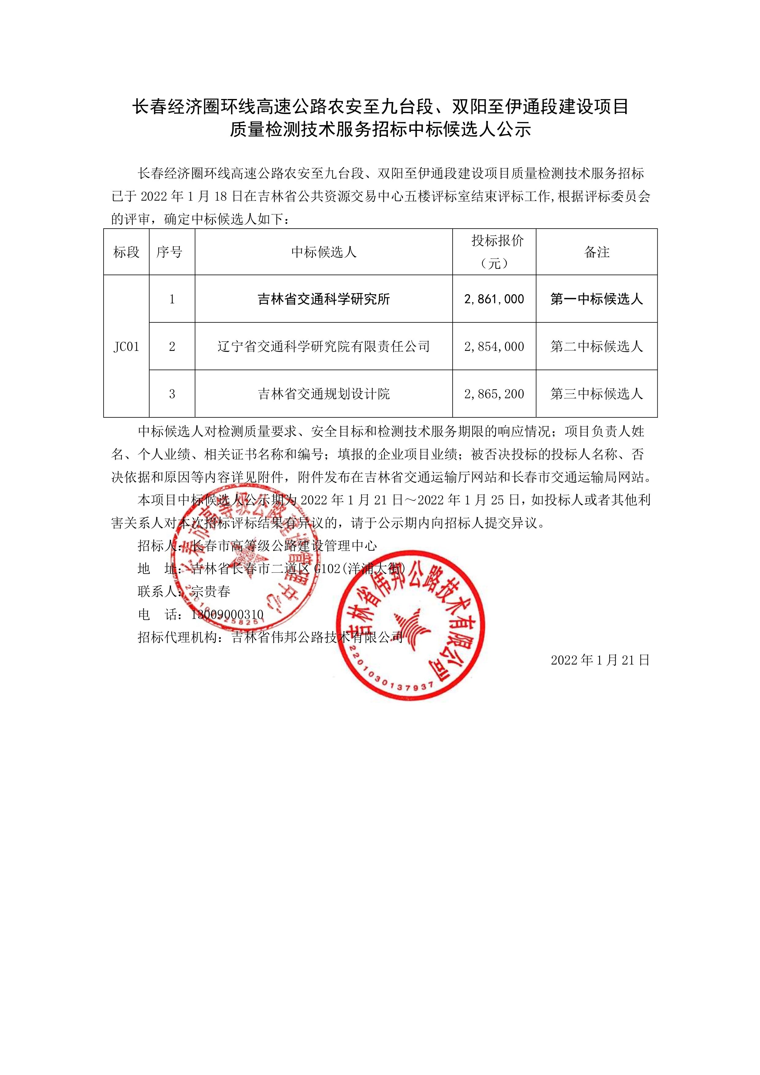 长春经济圈环线高速公路农安至九台段双阳至伊通段建设项目质量检测技术服务招标中标候选人公示