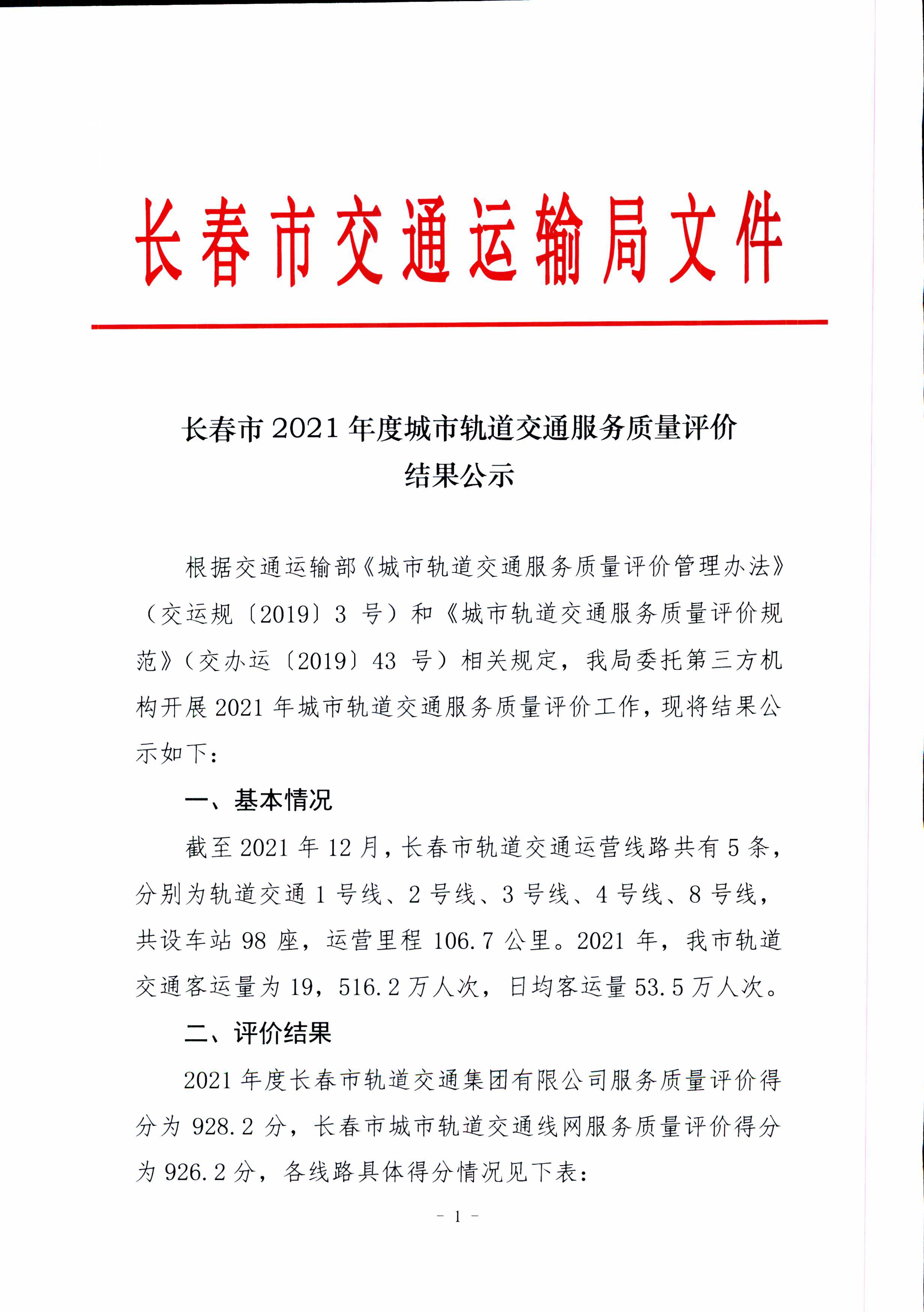 长春市2021年度城市轨道交通服务质量评价结果公示