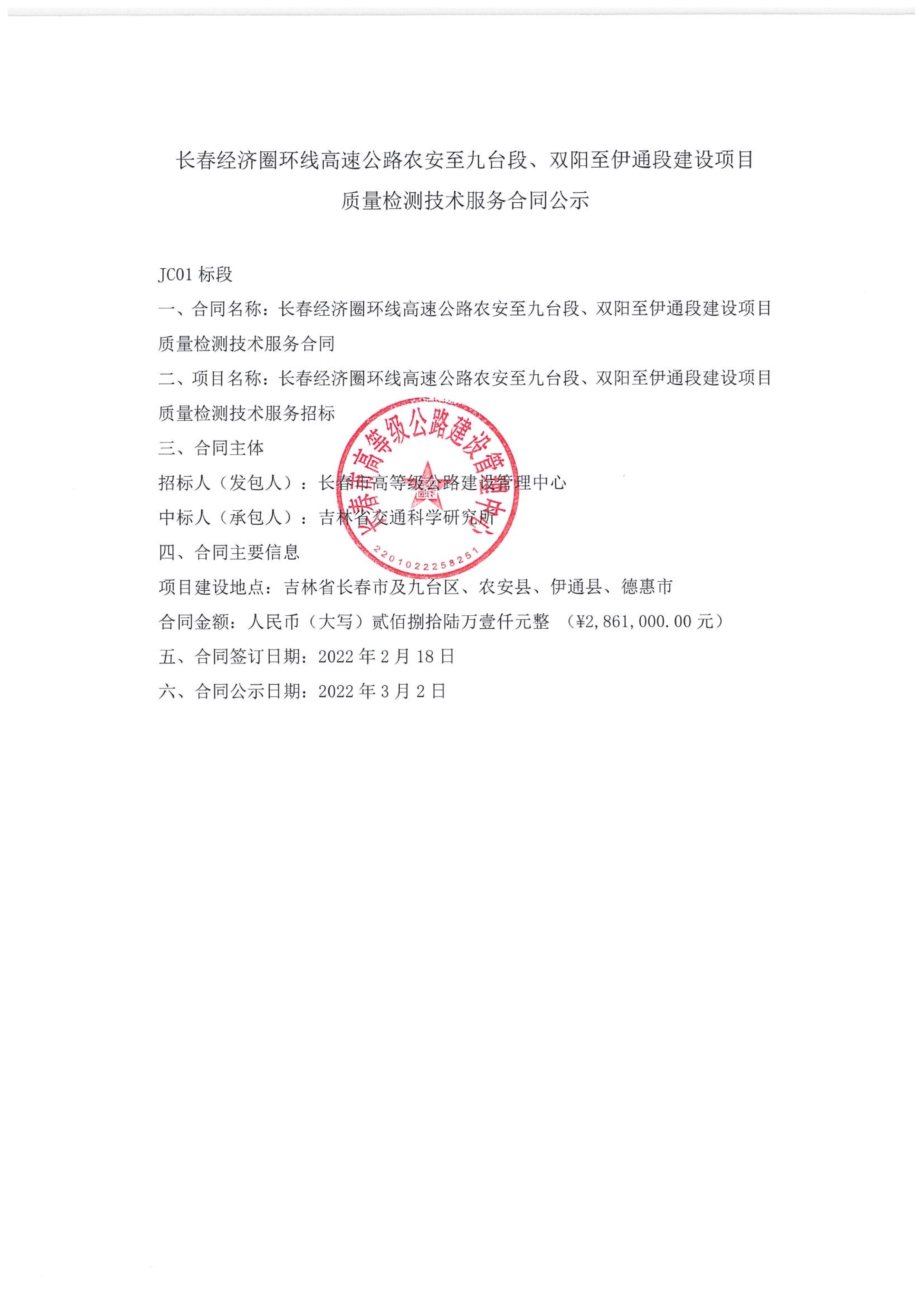 长春经济圈环线高速公路农安至九台段、双阳至伊通段建设项目质量检测技术服务合同公示