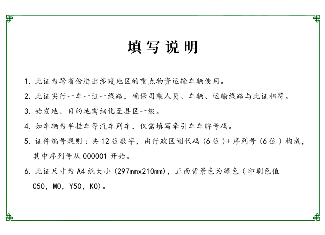 《通行证》编号为6位行政区域代码+6位序列号,省发改委、省工信厅、省公安厅、省交通运输厅、省商务厅、省农业农村厅、省邮政管理局等省直部门在《通行证》上加盖公章后对口核发到市(州)、县(市、区),并通过官方网站、微信公众号、热线电话等方式,向社会公布办理流程。用证单位或使用人根据物资类别填写车辆、司乘人员、起讫地、经营者信息后,向所在地相关部门提出申请,发证部门核实信息后,可通过现场发放纸质《通行证》或微信、QQ等方式以PDF电子格式,发送给用证单位或使用人,纸质和电子《通行证》具有同等效力。