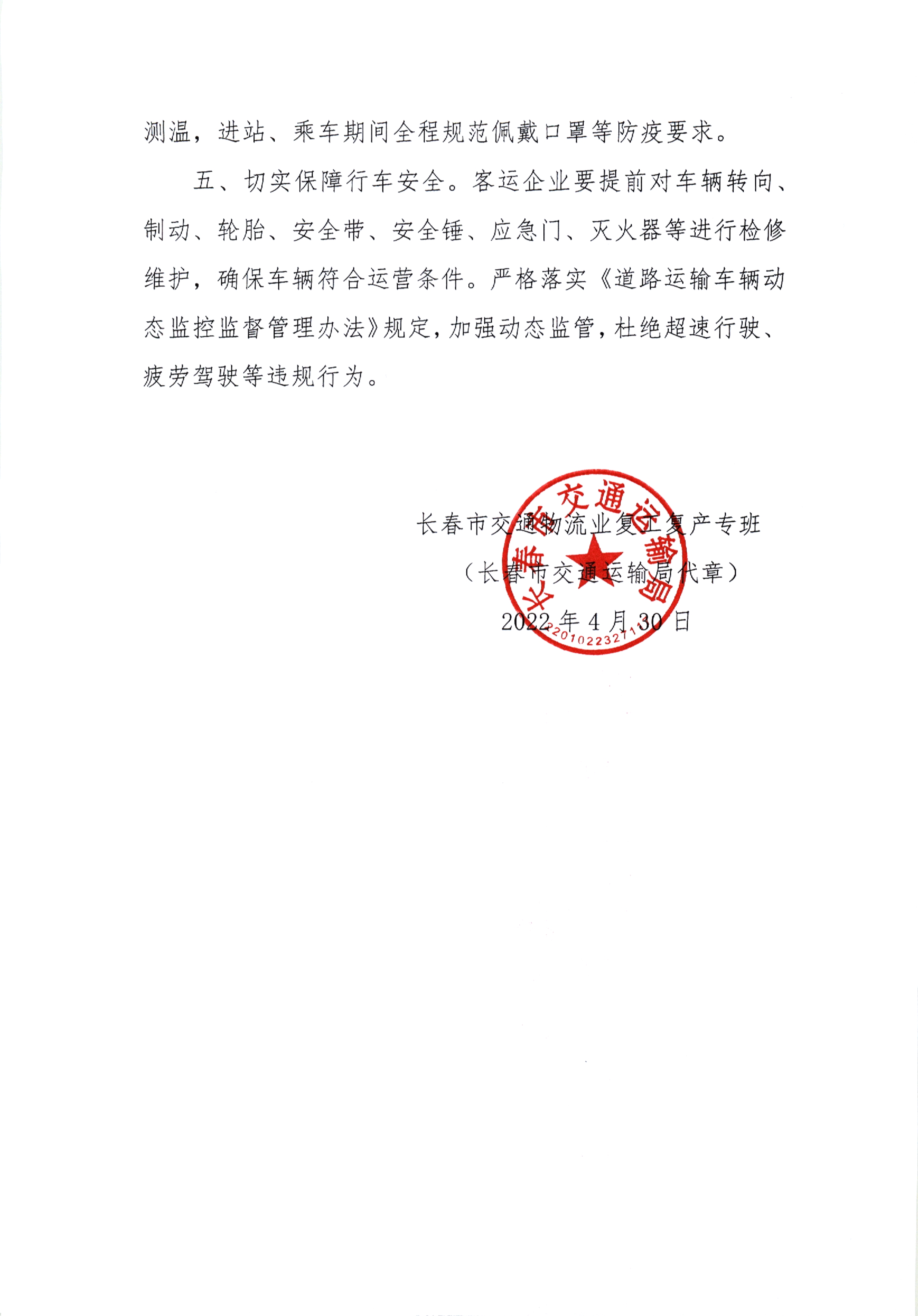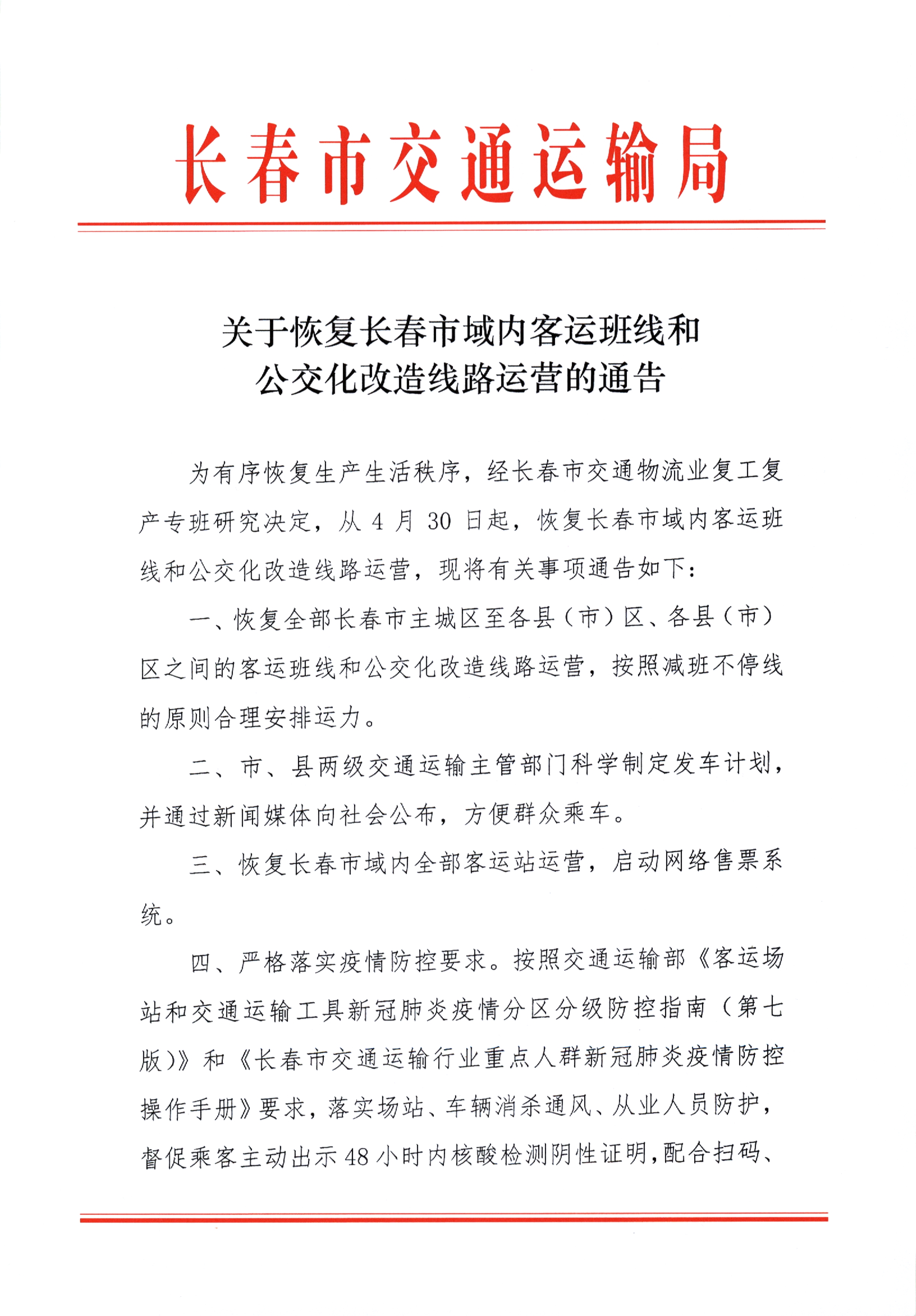 关于恢复长春市域内客运班线和公交化改造线路运营的通告