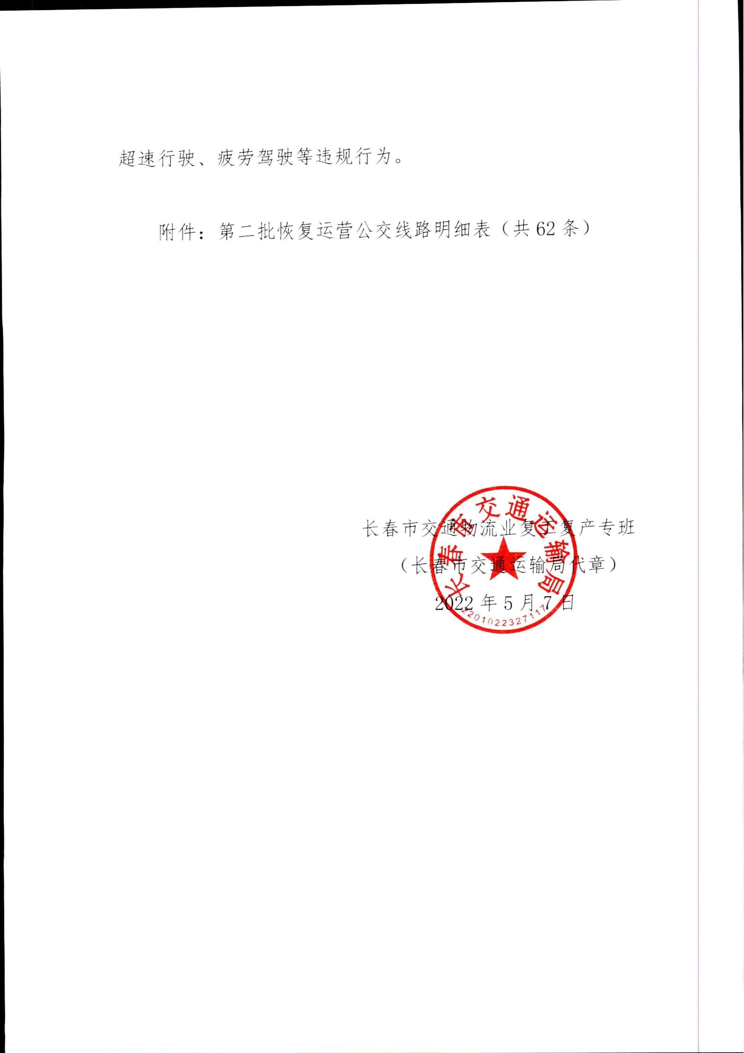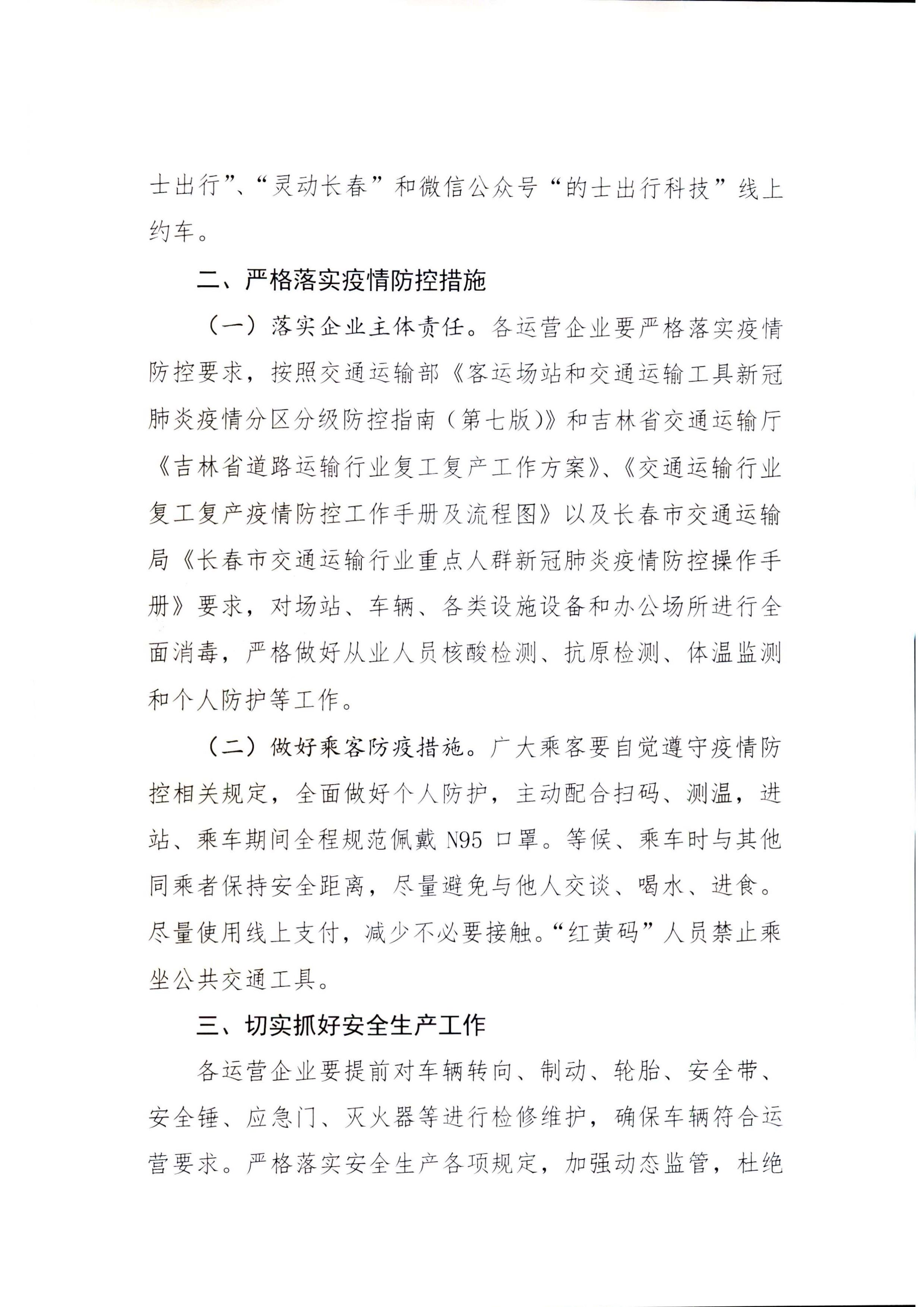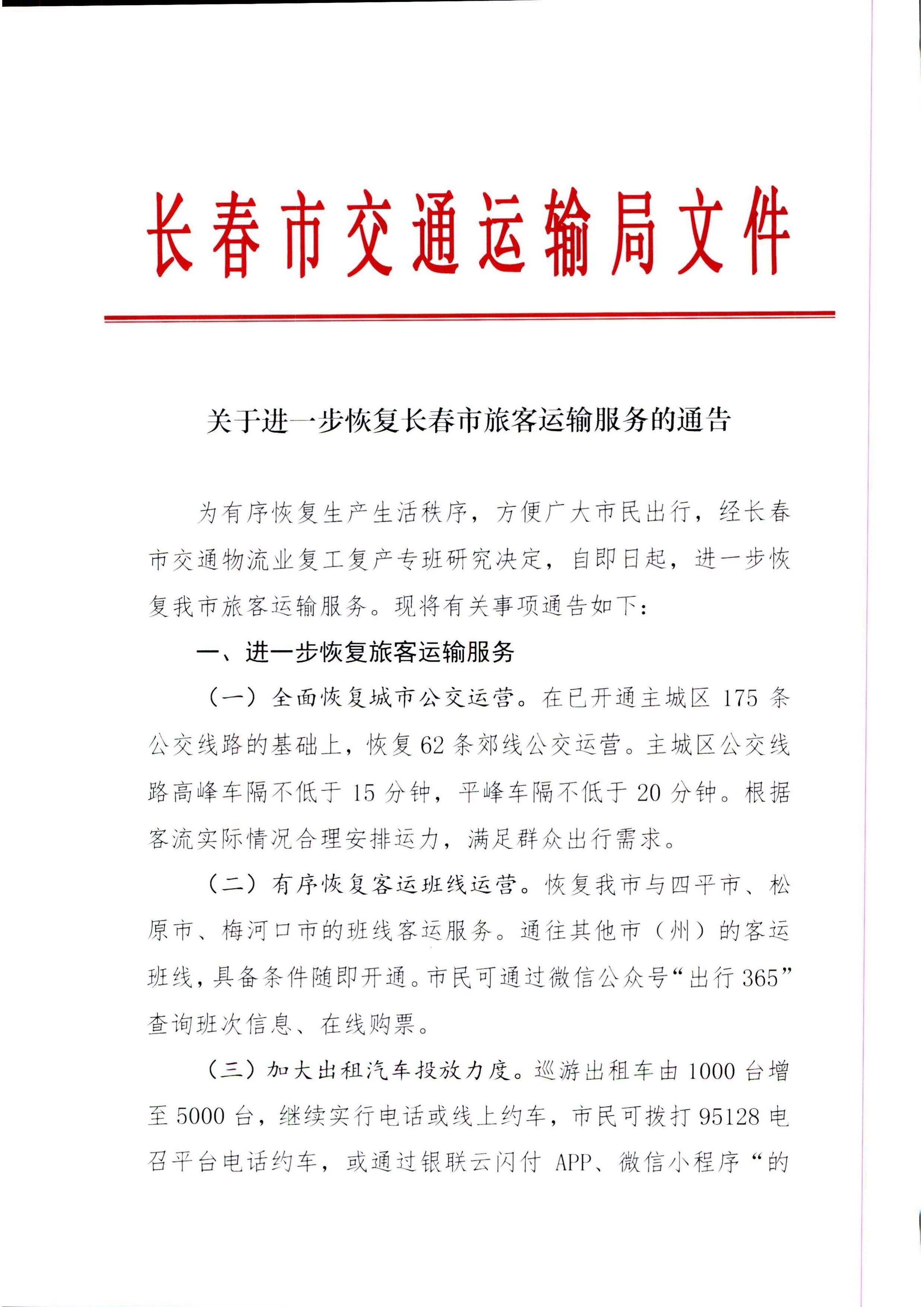 关于进一步恢复长春市旅客运输服务的通告