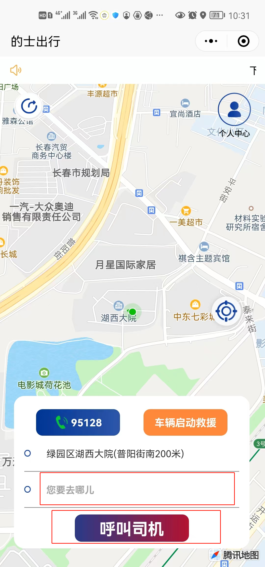 第二步,进入“的士出行”程序输入目的地,点击呼叫司机。
