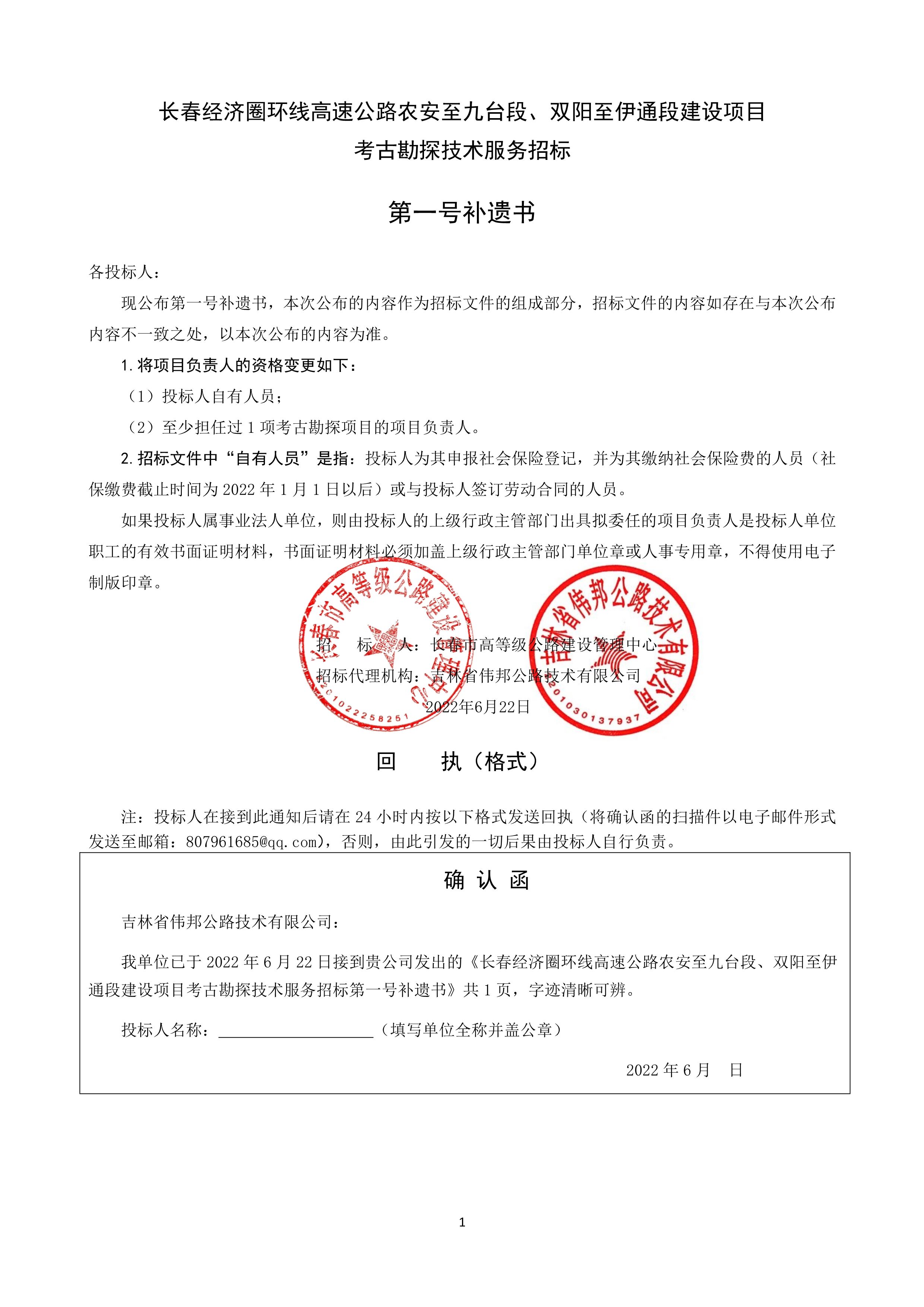长春经济圈环线高速公路农安至九台段、双阳至伊通段建设项目考古勘探技术服务招标第一号补遗书