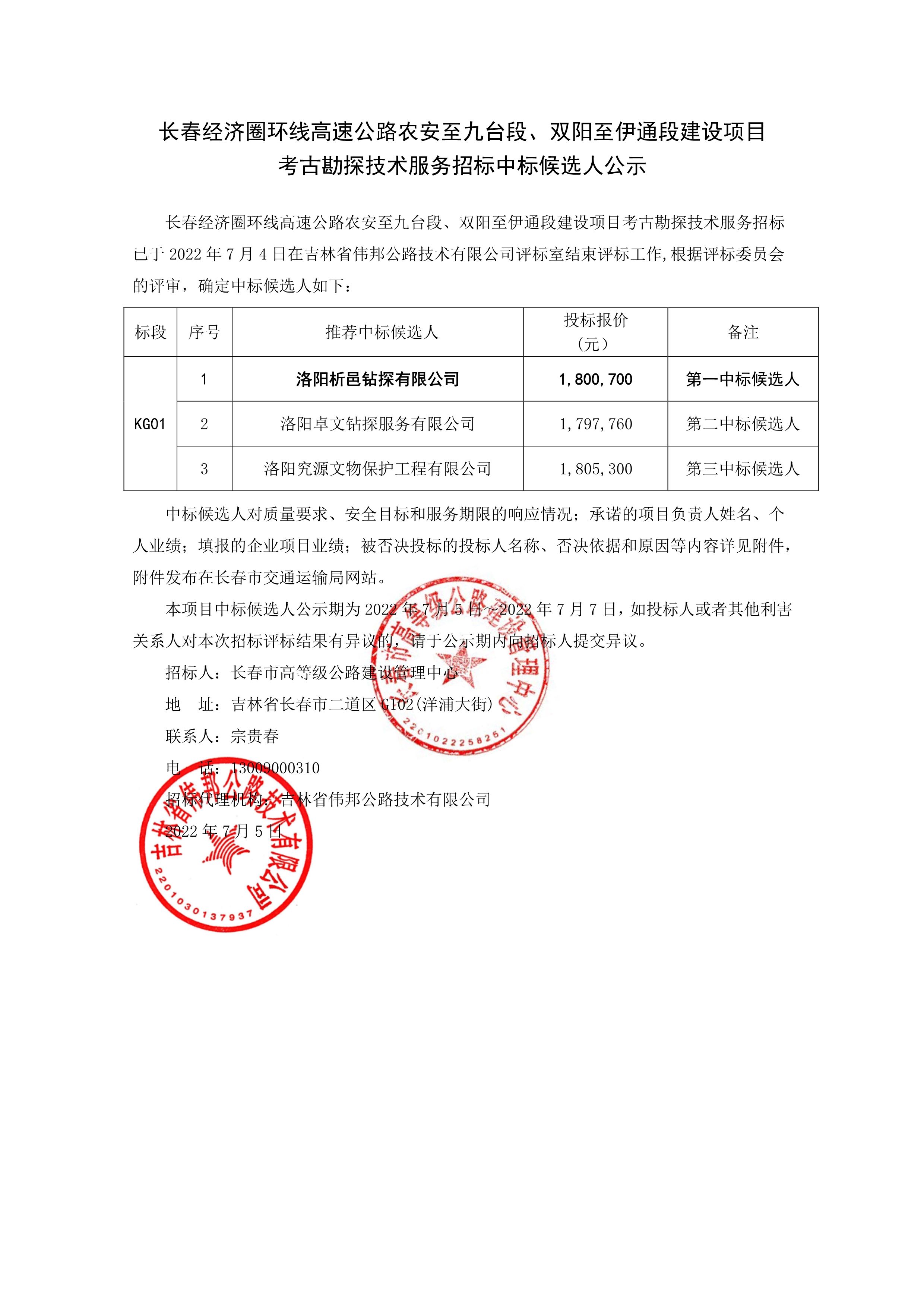 长春经济圈环线高速公路农安至九台段、双阳至伊通段建设项目考古勘探技术服务招标中标候选人公示