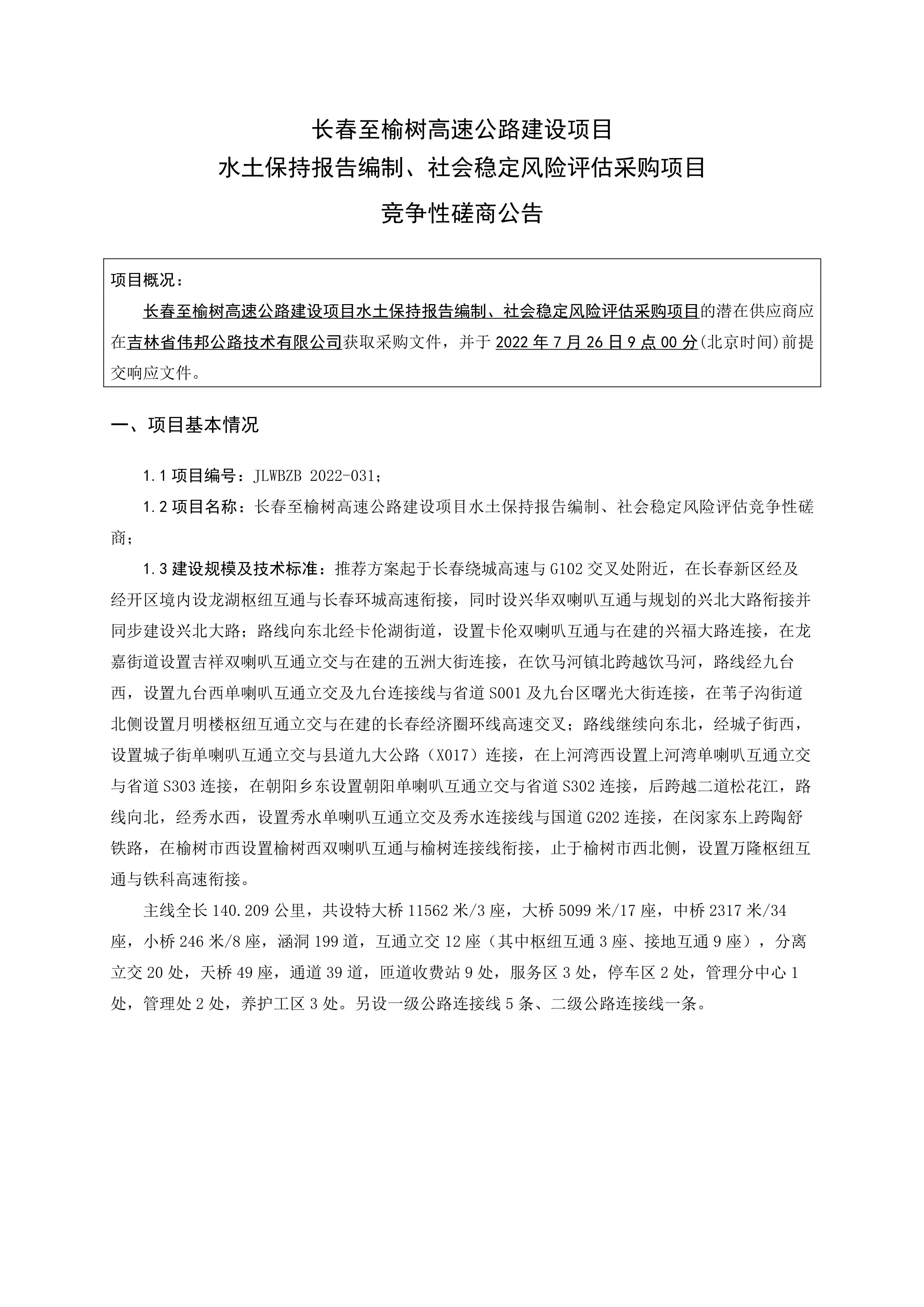 长春至榆树高速公路建设项目水土保持报告编制、社会稳定风险评估采购项目竞争性磋商公告