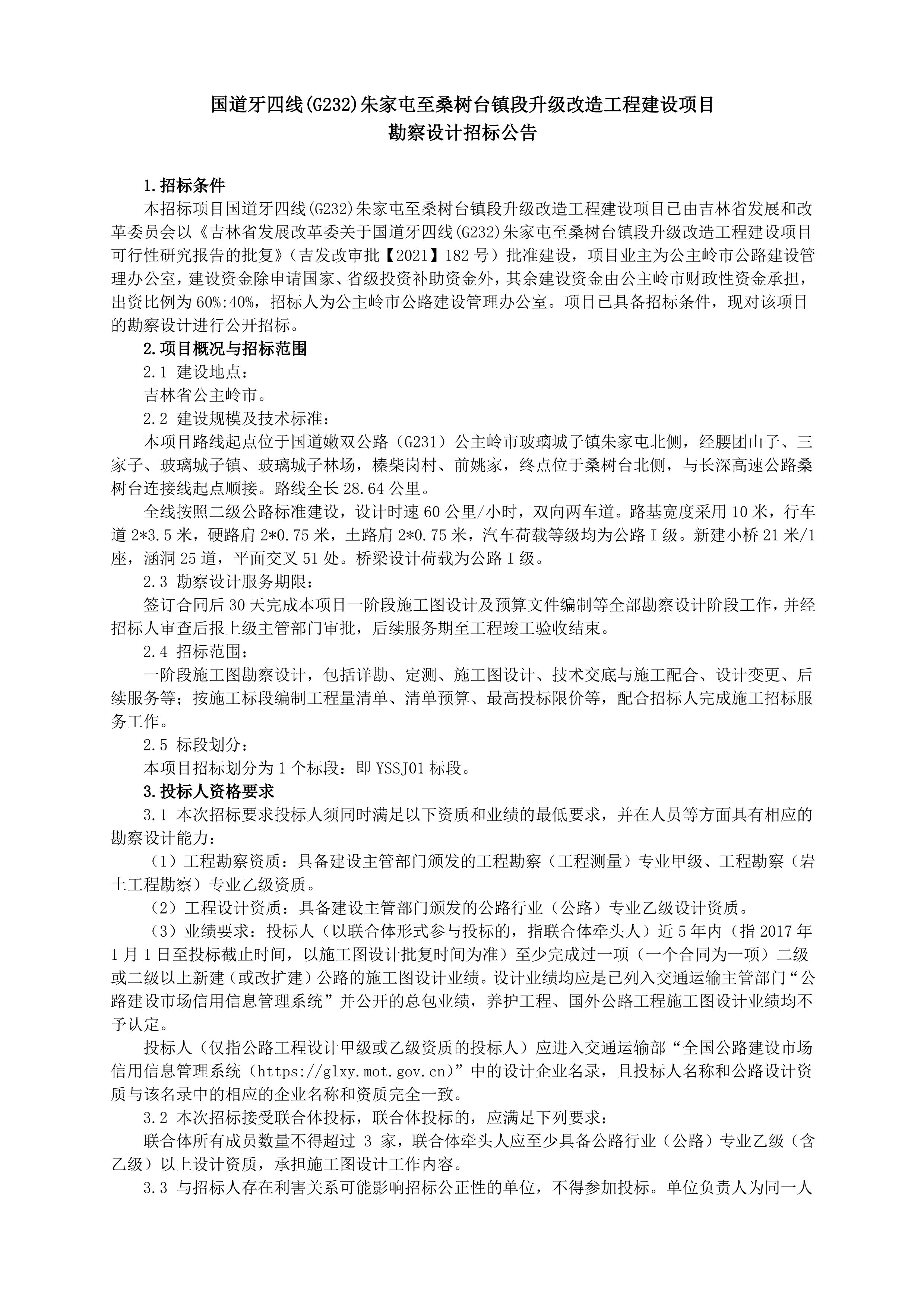 国道牙四线(G232)朱家屯至桑树台镇段升级改造工程建设项目勘察设计招标公告及标文件关键内容信息公开.pdf