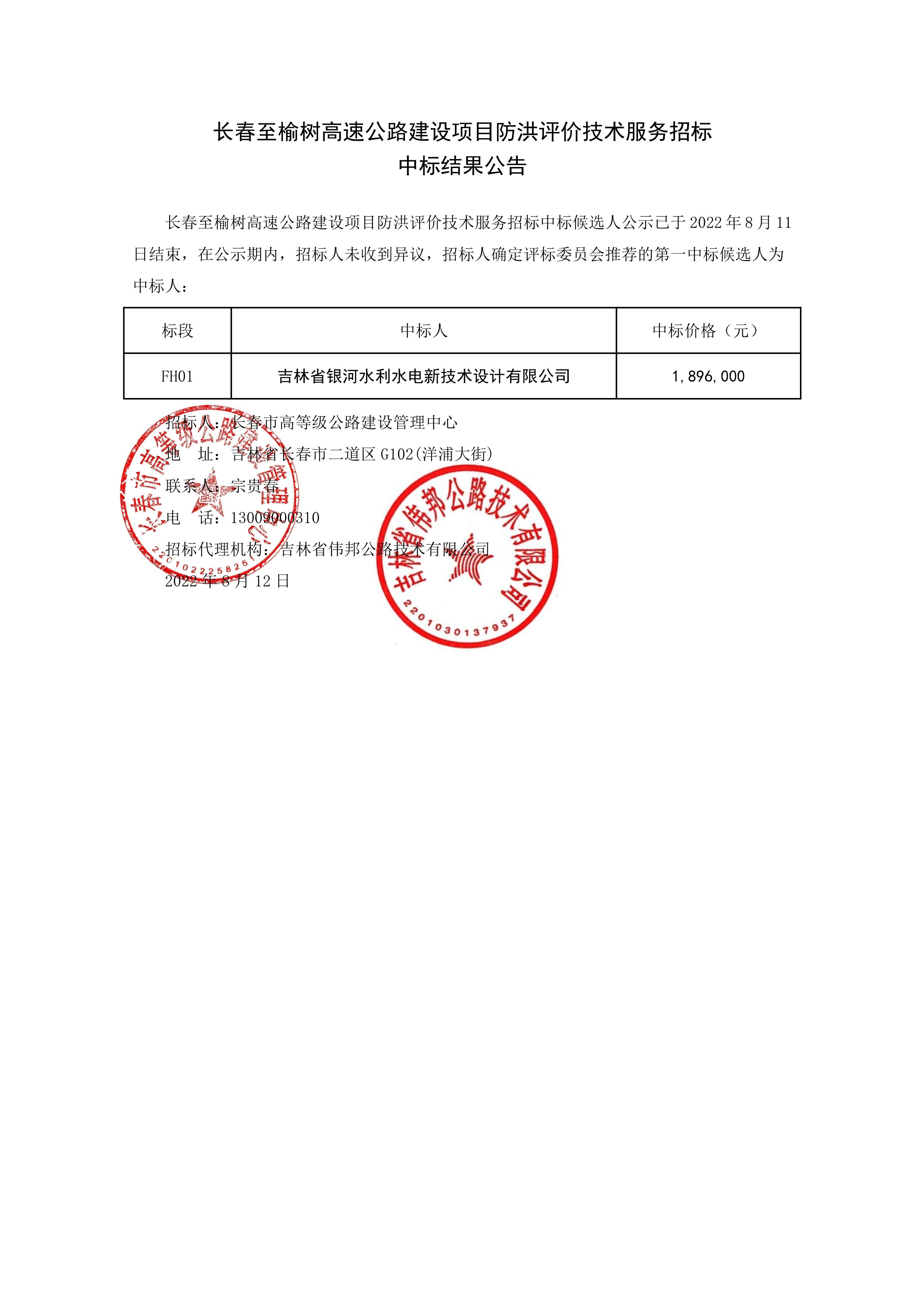 长春至榆树高速公路建设项目防洪评价技术服务招标中标结果公告