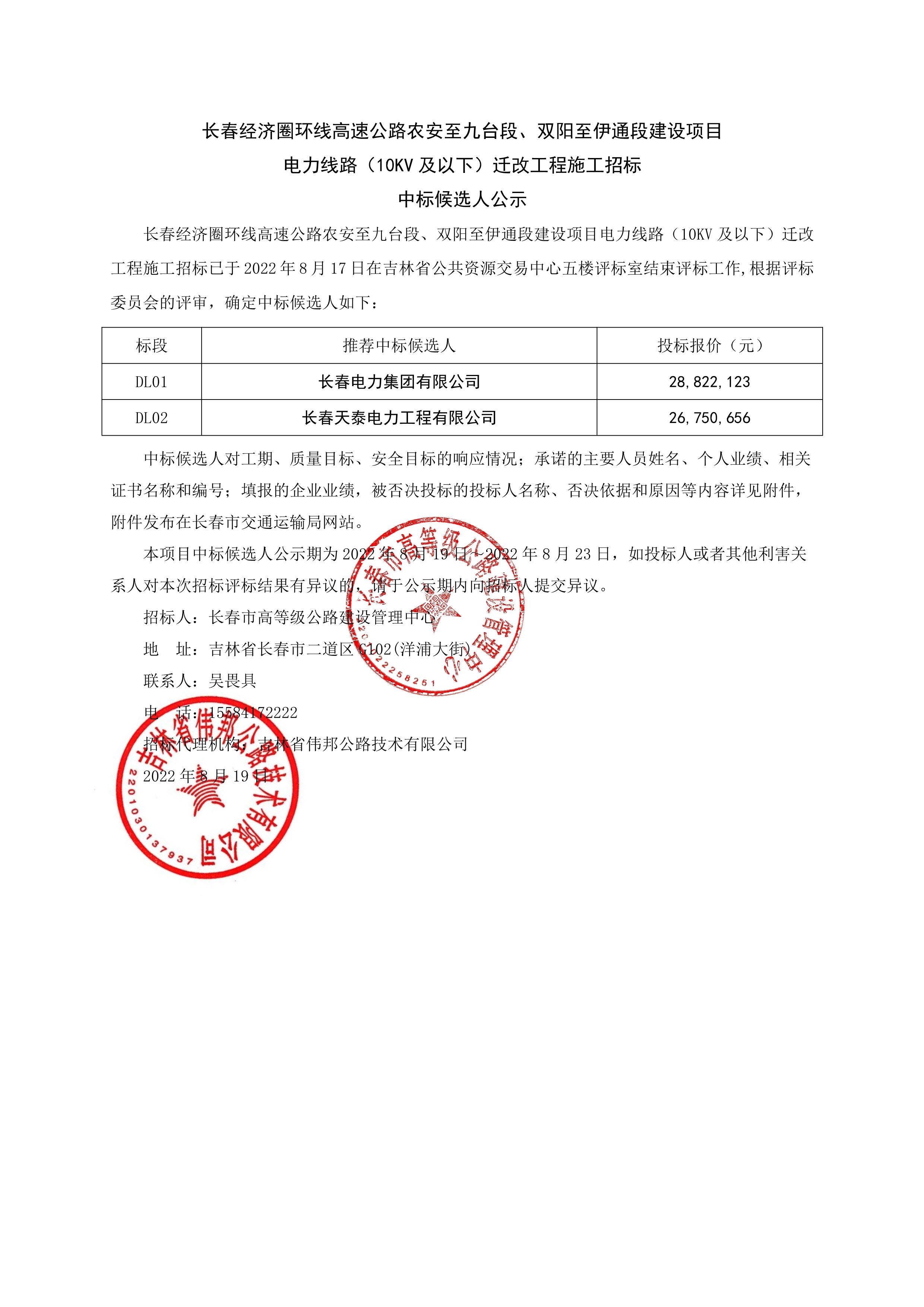 长春经济圈环线高速公路农安至九台段、双阳至伊通段建设项目电力线路(10KV及以下)迁改工程施工招标中标候选人公示