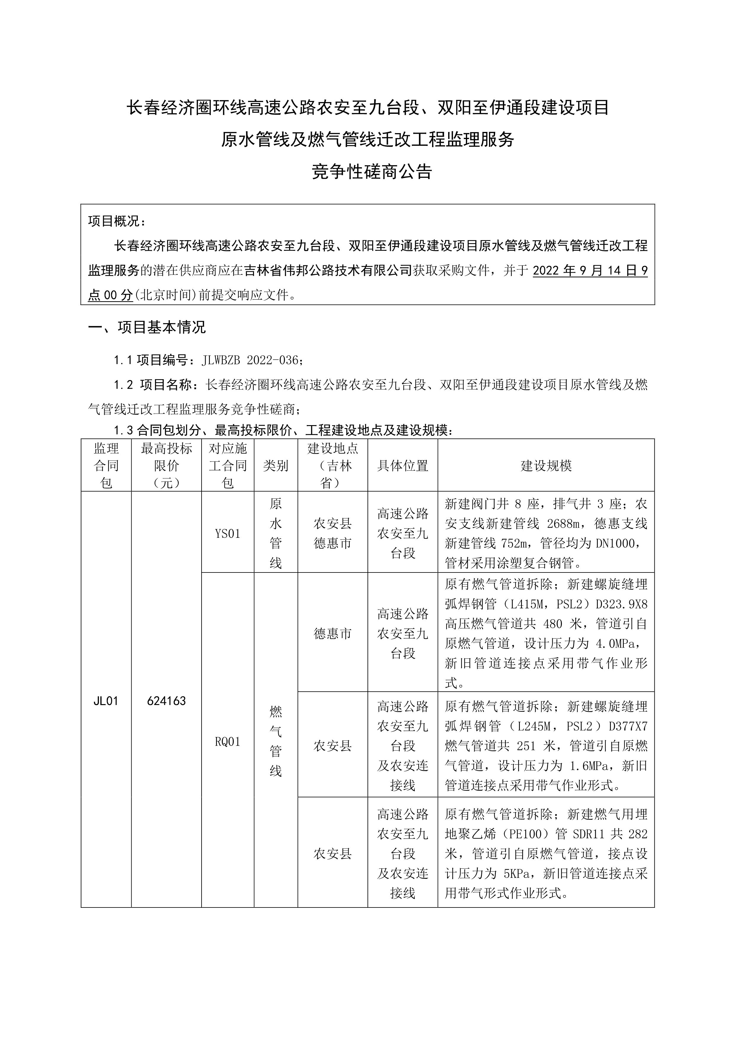 长春经济圈环线高速公路农安至九台段、双阳至伊通段建设项目原水管线及燃气管线迁改工程监理服务竞争性磋商公告