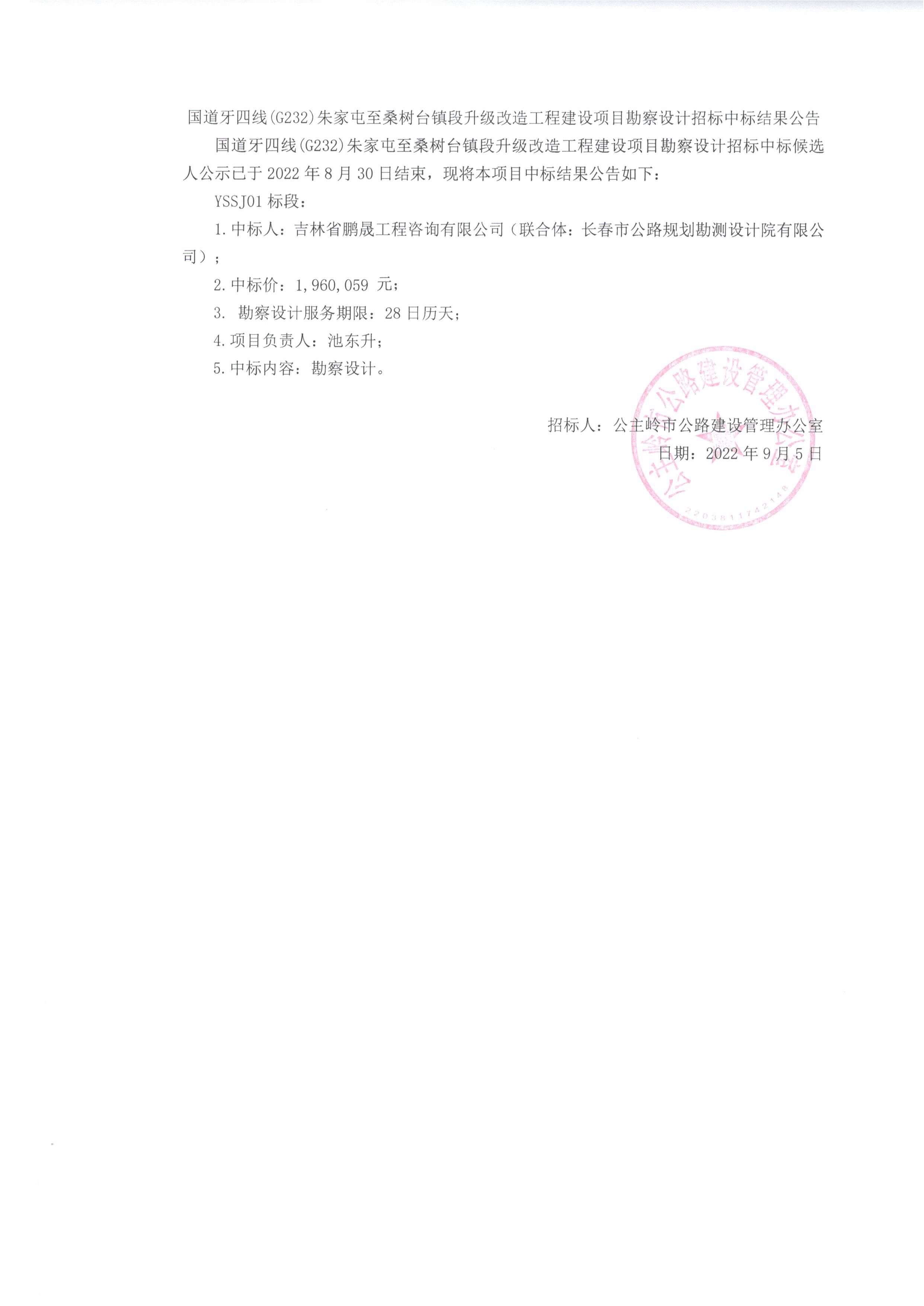 国道牙四线(G232)朱家屯至桑树台镇段升级改造工程建设项目勘察设计招标中标结果公示.pdf