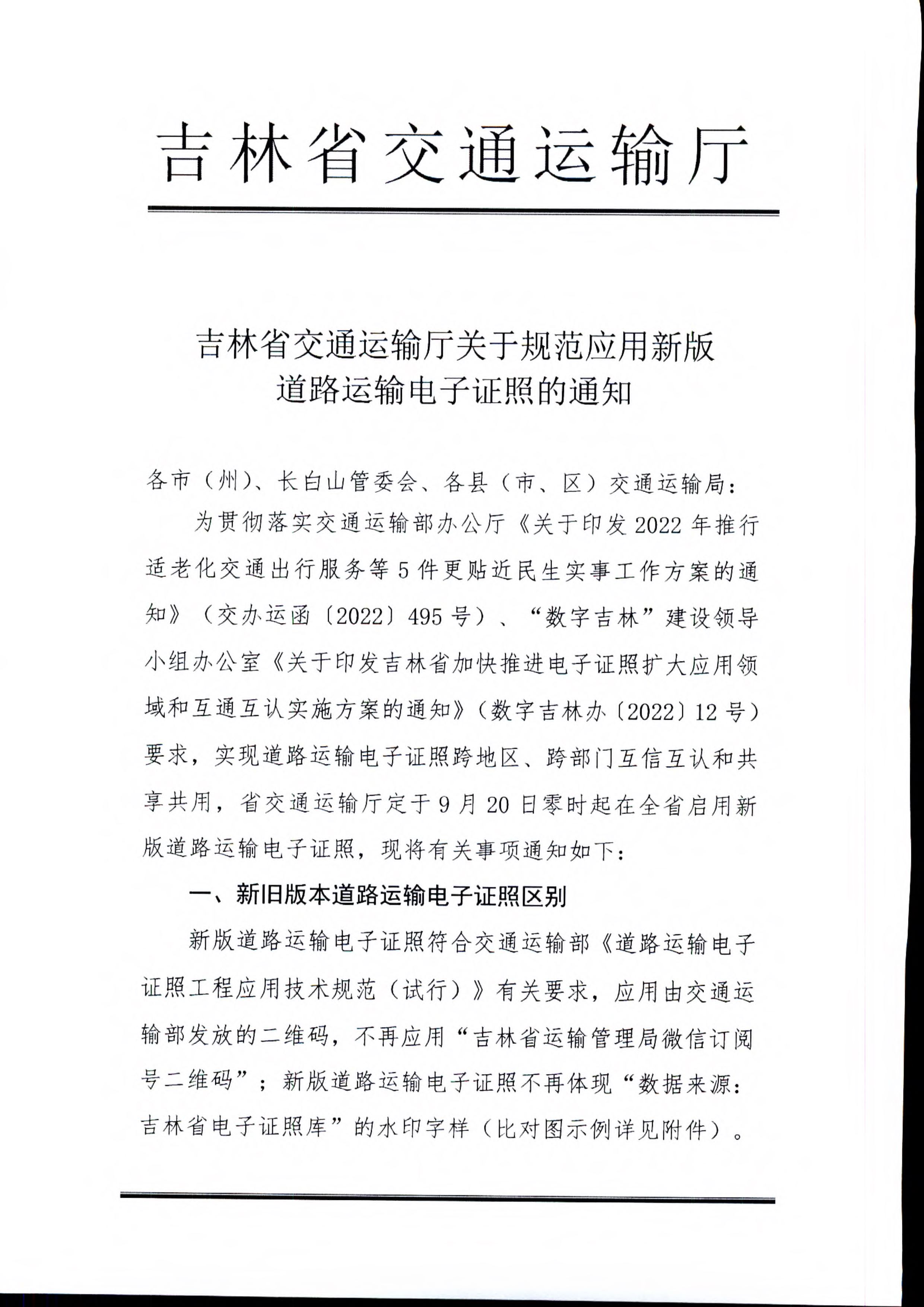 吉林省交通运输厅关于规范应用新版道路运输电子证照的通知
