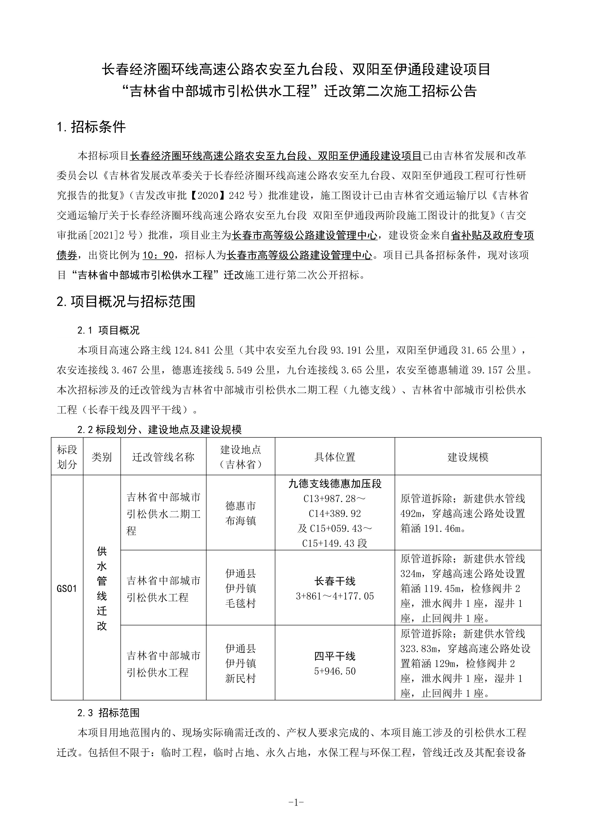 长春经济圈环线高速公路农安至九台段、双阳至伊通段建设项目“吉林省中部城市引松供水工程”迁改第二次施工招标公告.pdf
