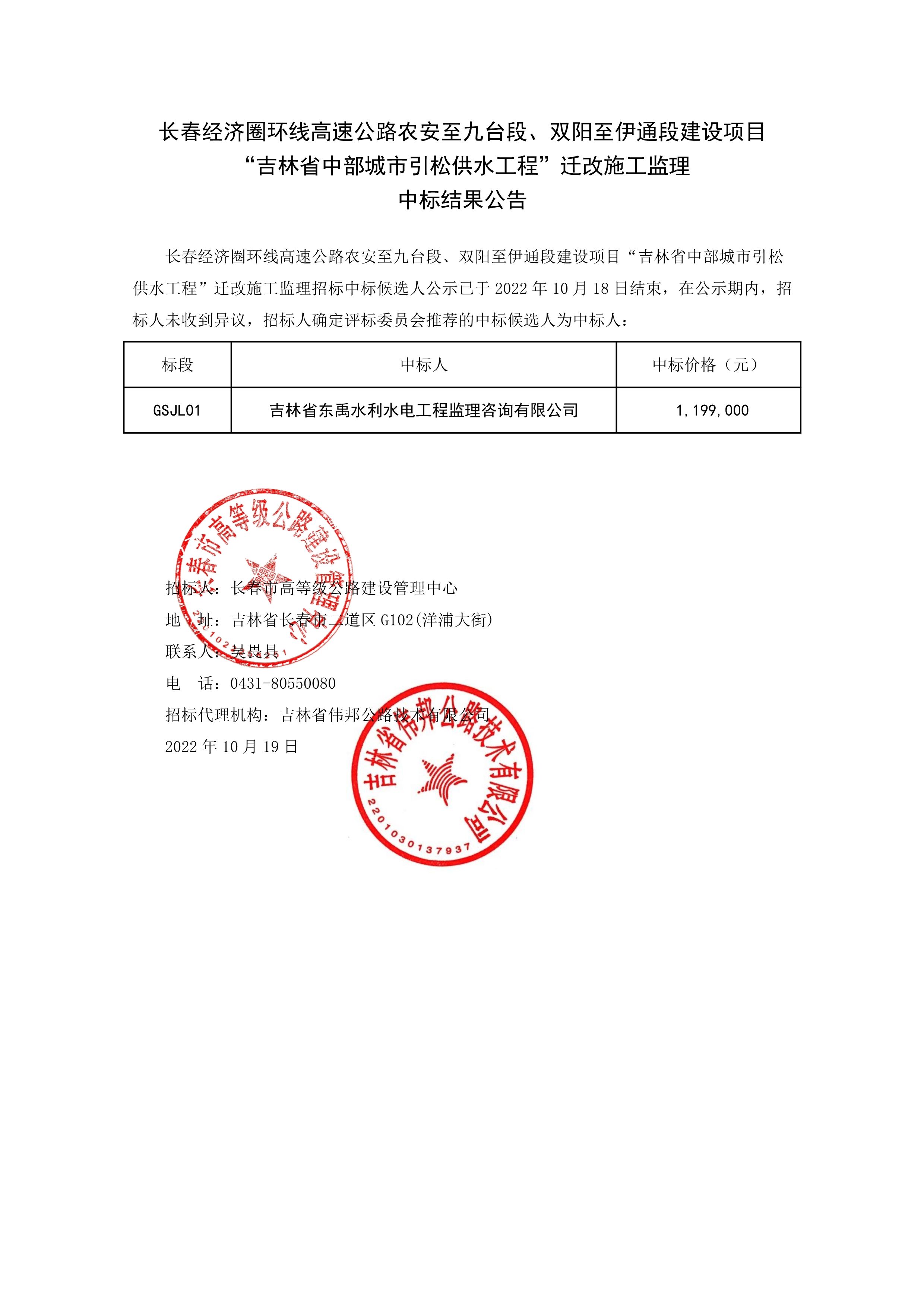 长春经济圈环线高速公路农安至九台段、双阳至伊通段建设项目“吉林省中部城市引松供水工程”迁改施工监理中标结果公告