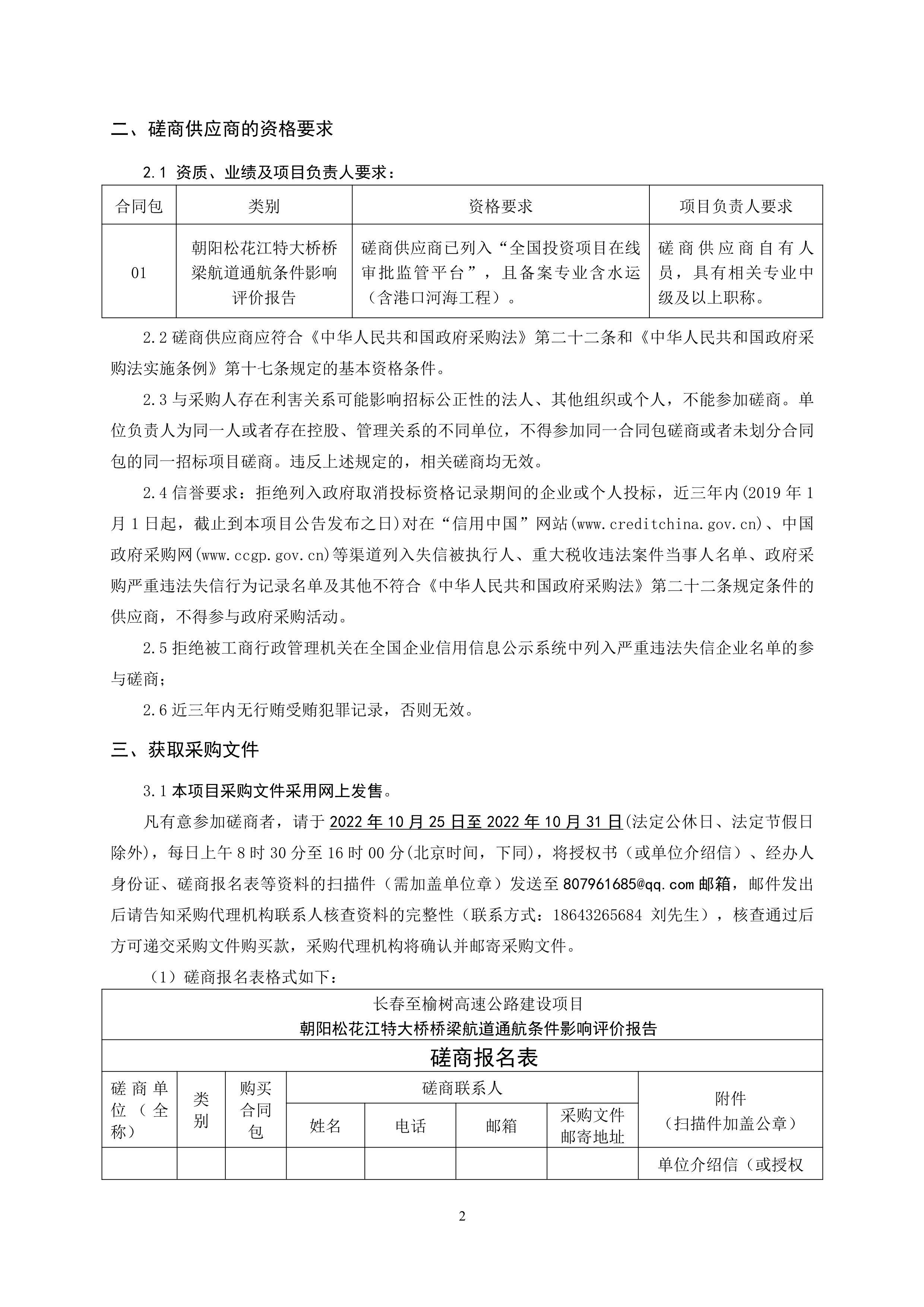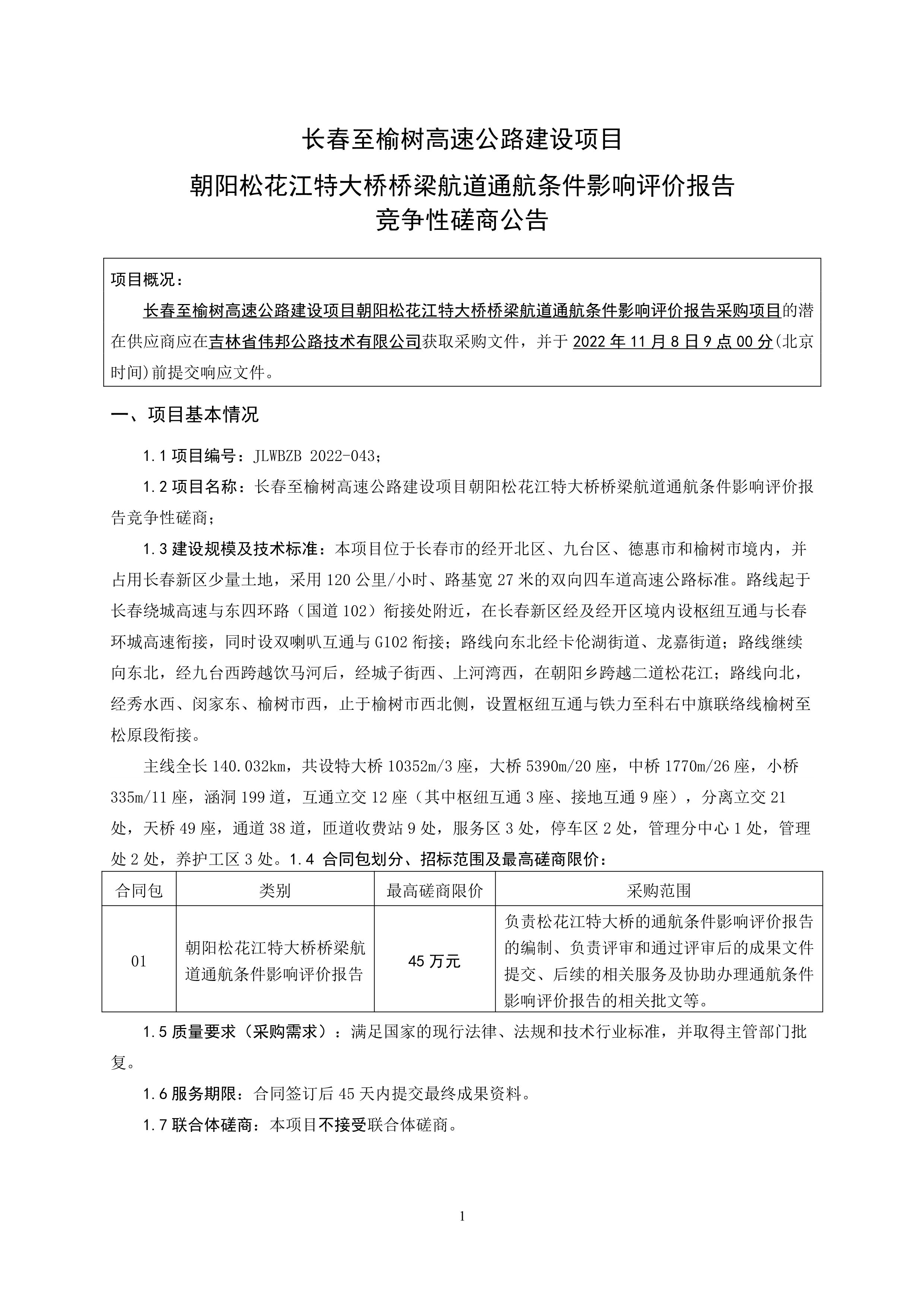 长春至榆树高速公路建设项目朝阳松花江特大桥桥梁航道通航条件影响评价报告竞争性磋商公告