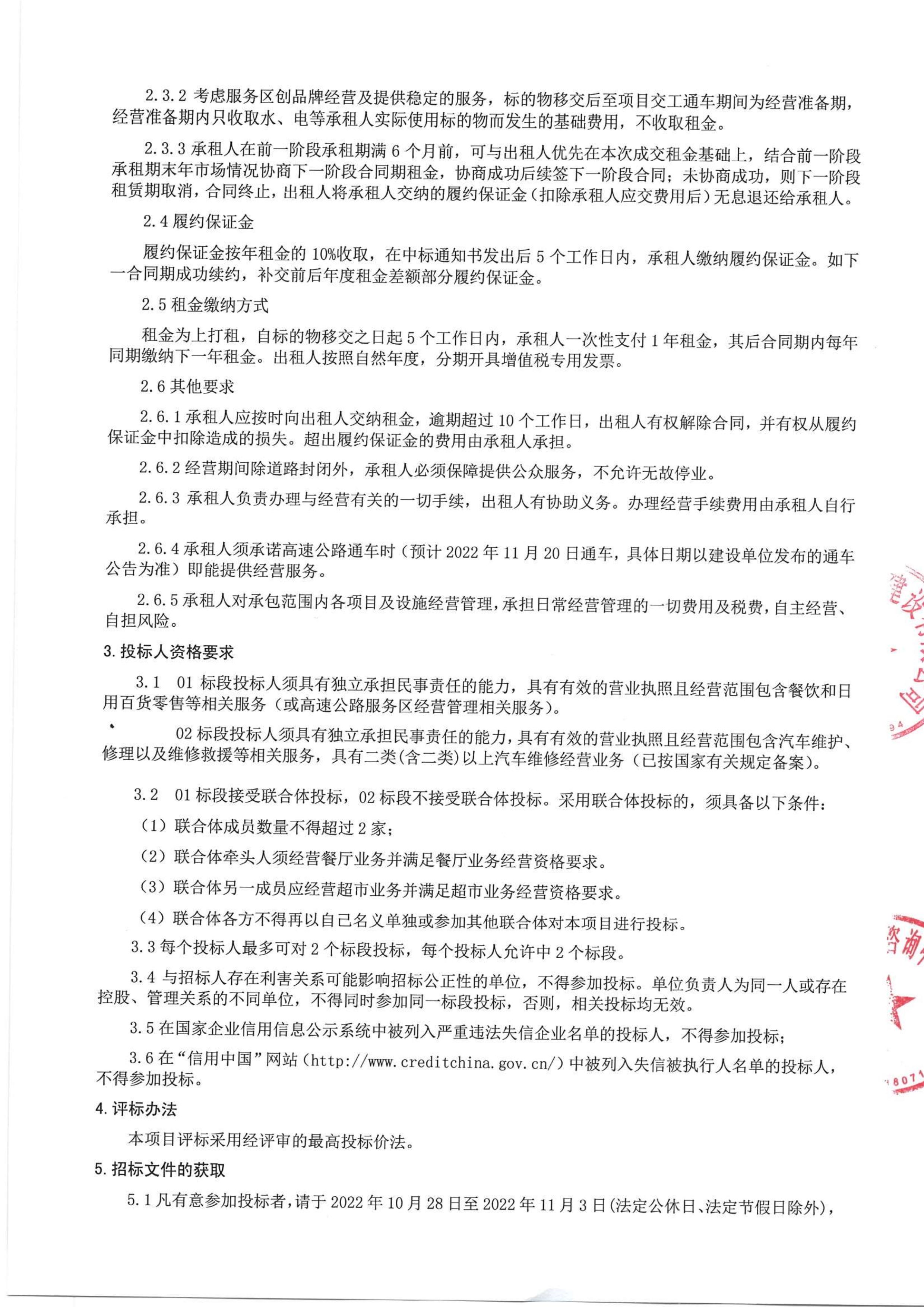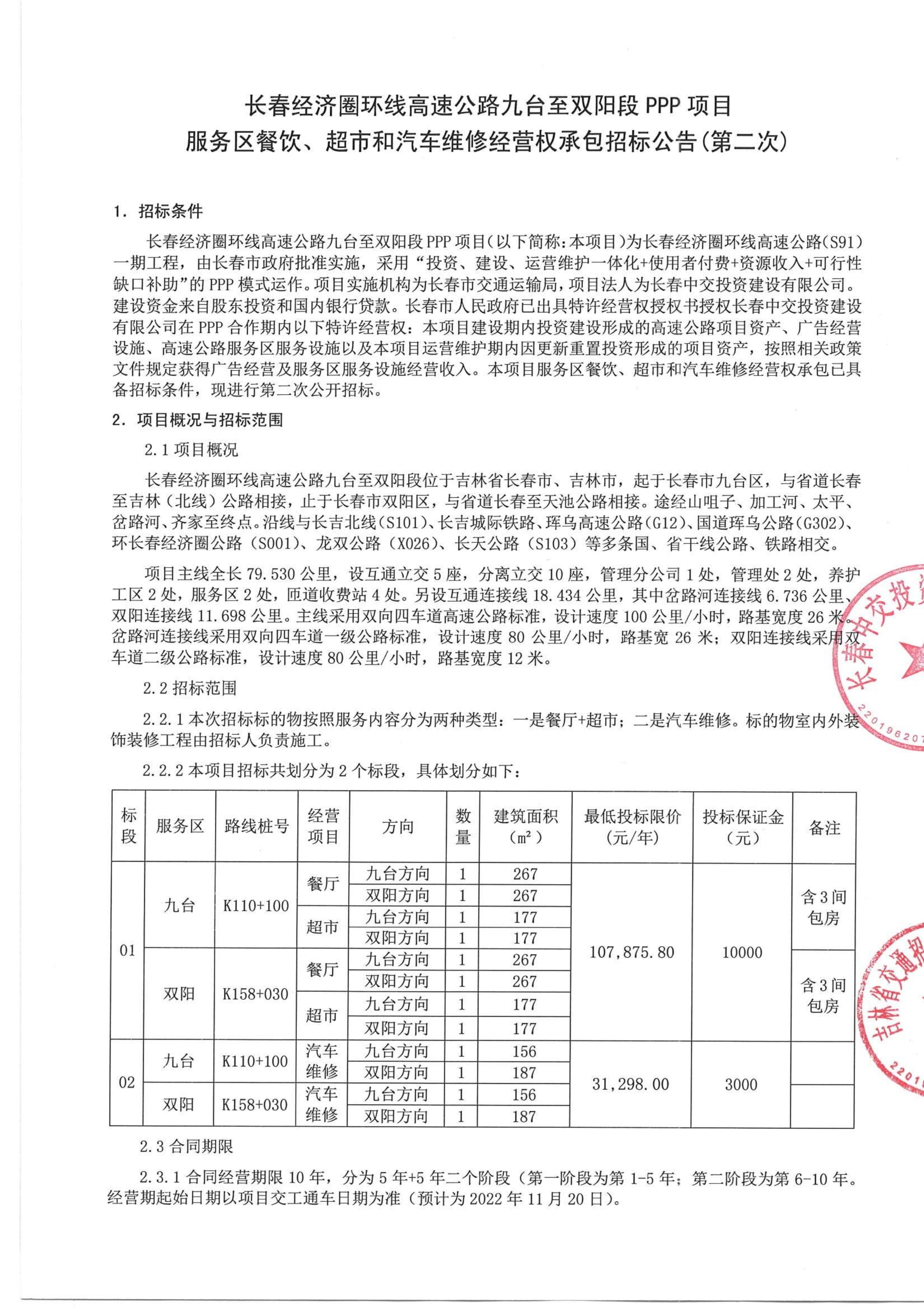 长春经济圈环线高速公路九台至双阳段PPP项目服务区餐饮、超市和汽修经营权承包招标公告(第二次)及招标文件关键内容信息公开.PDF