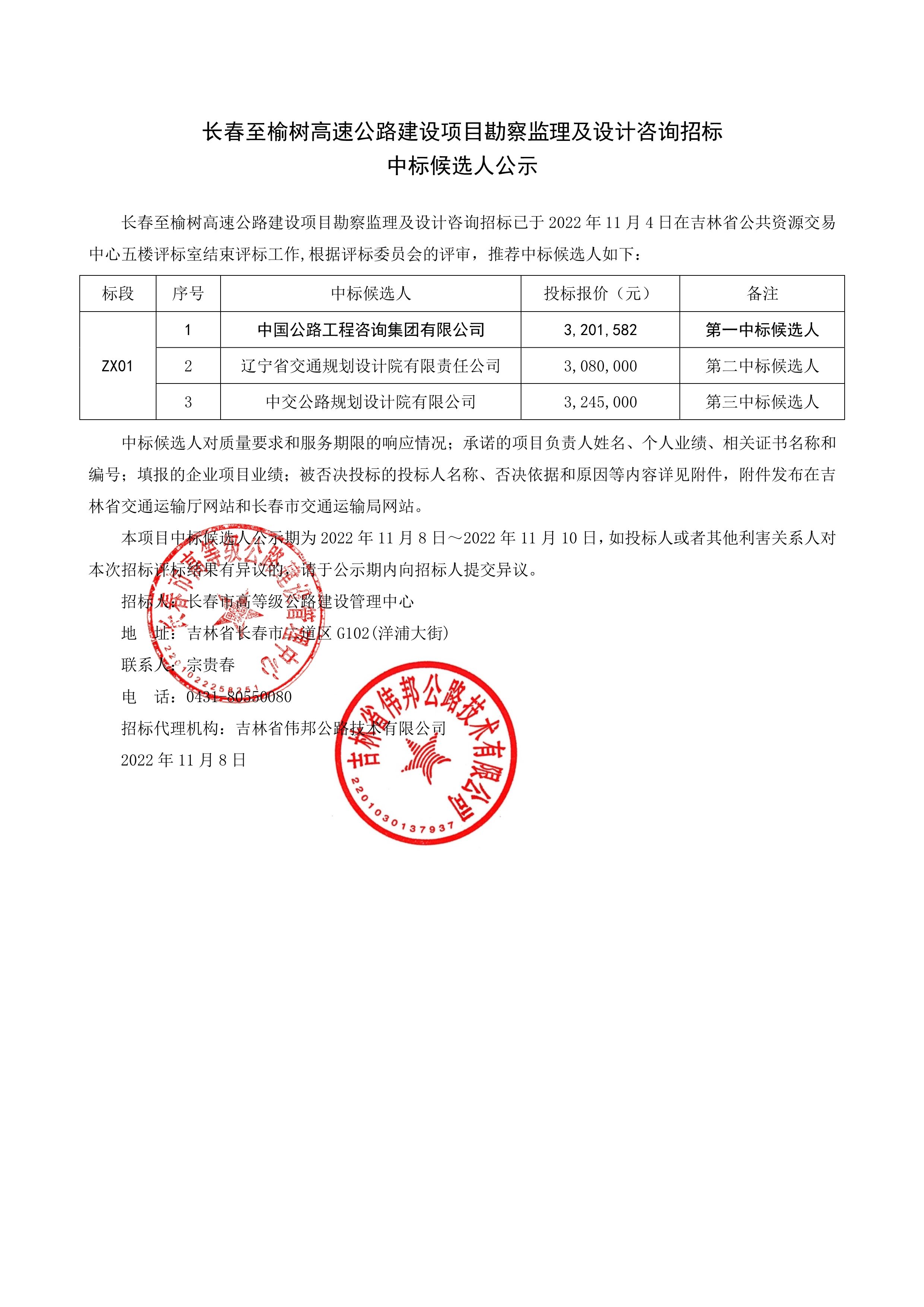 长春至榆树高速公路建设项目勘察监理及设计咨询招标中标候选人公示
