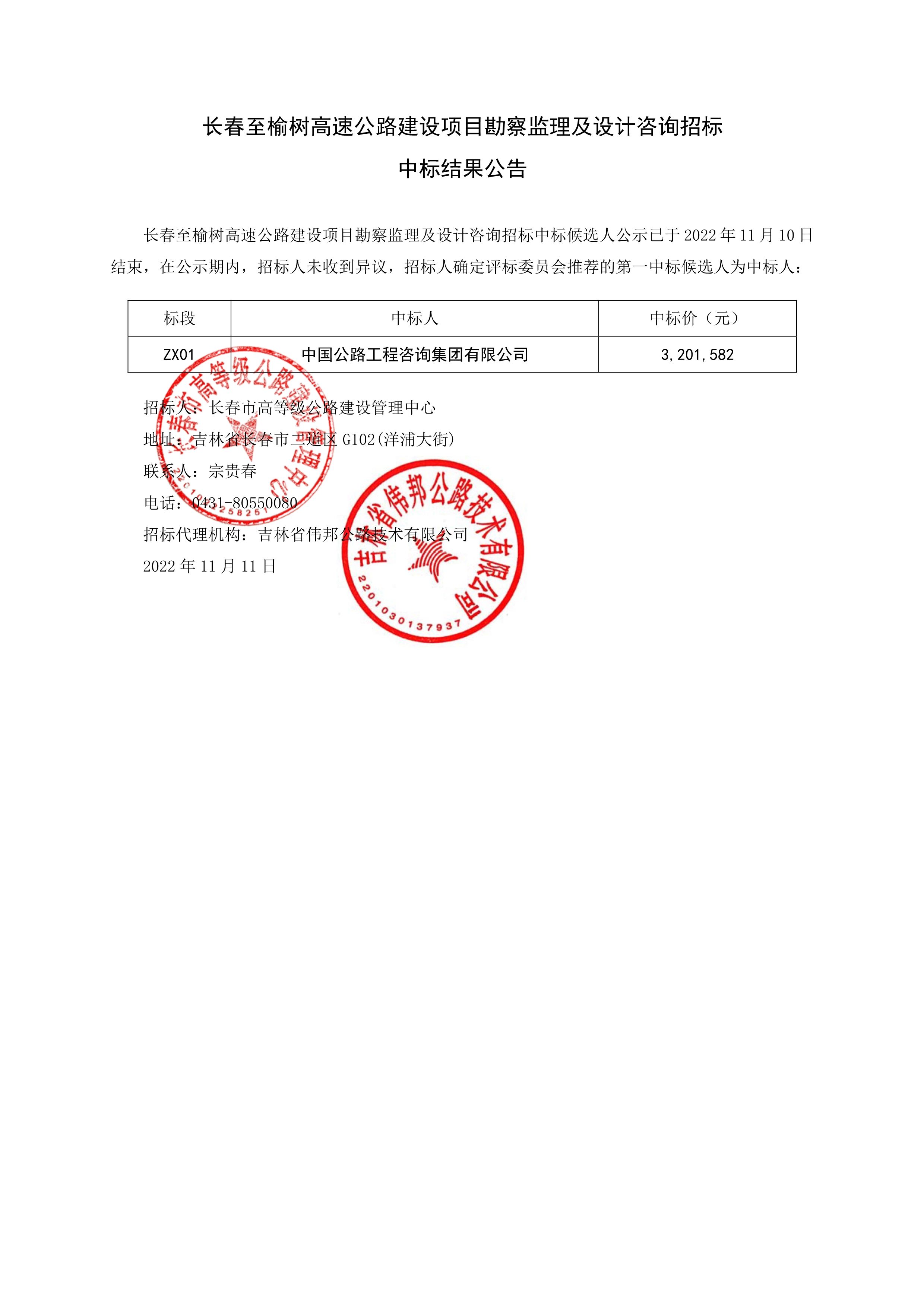 长春至榆树高速公路建设项目勘察监理及设计咨询招标中标结果公告.pdf