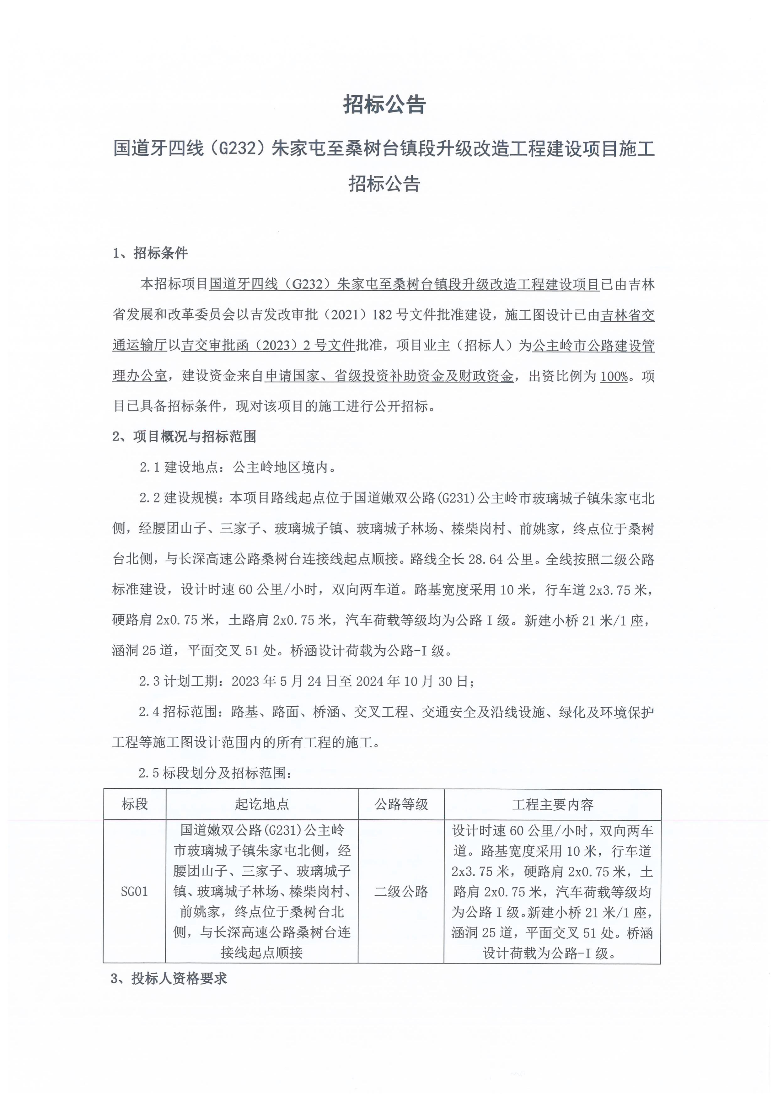 国道牙四线(G232)朱家屯至桑树台镇段升级改造工程建设项目施工招标公告