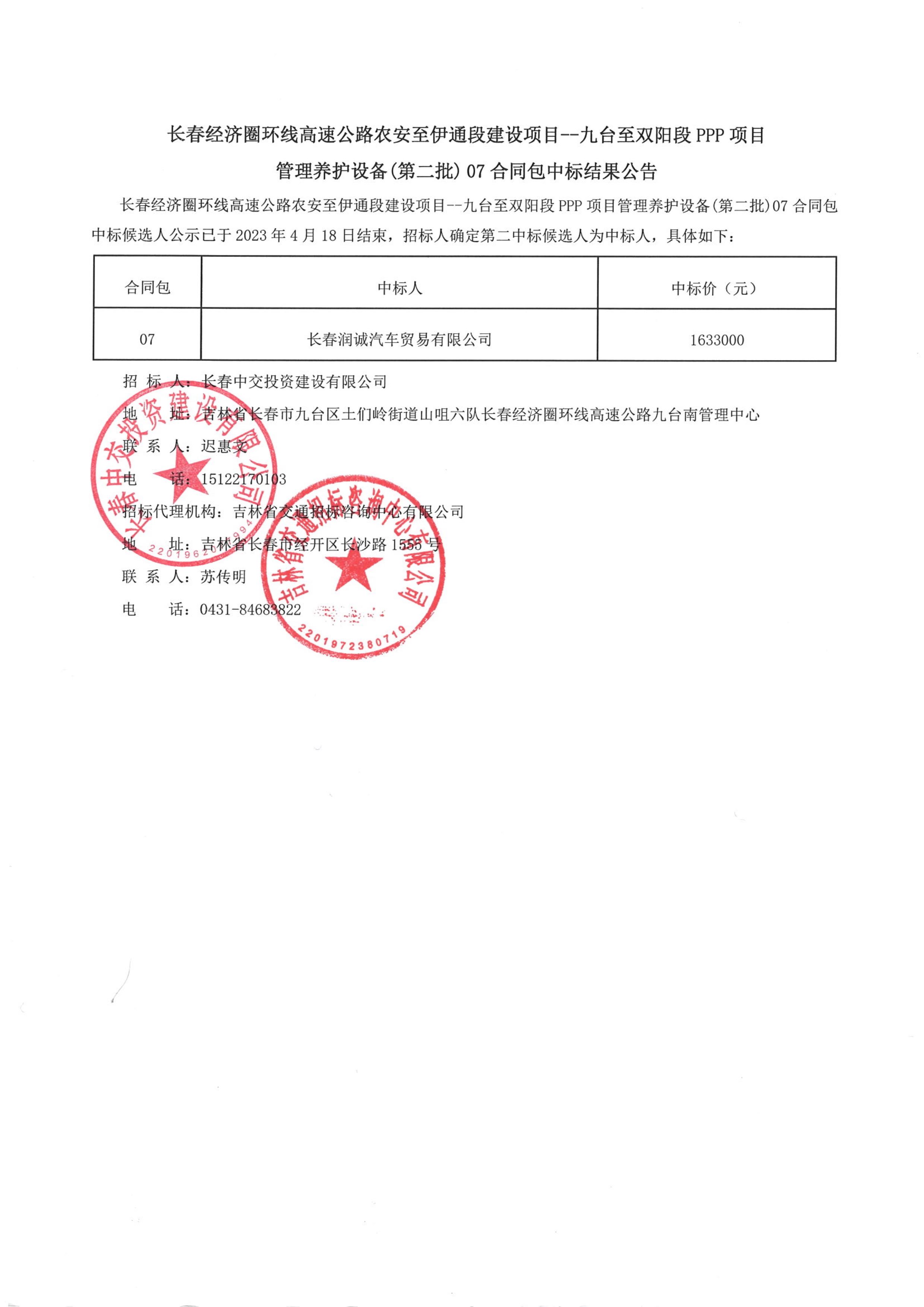 长春经济圈环线高速公路农安至伊通段建设项目--九台至双阳段PPP项目管理养护设备(第二批)07合同包中标结果公告.PDF