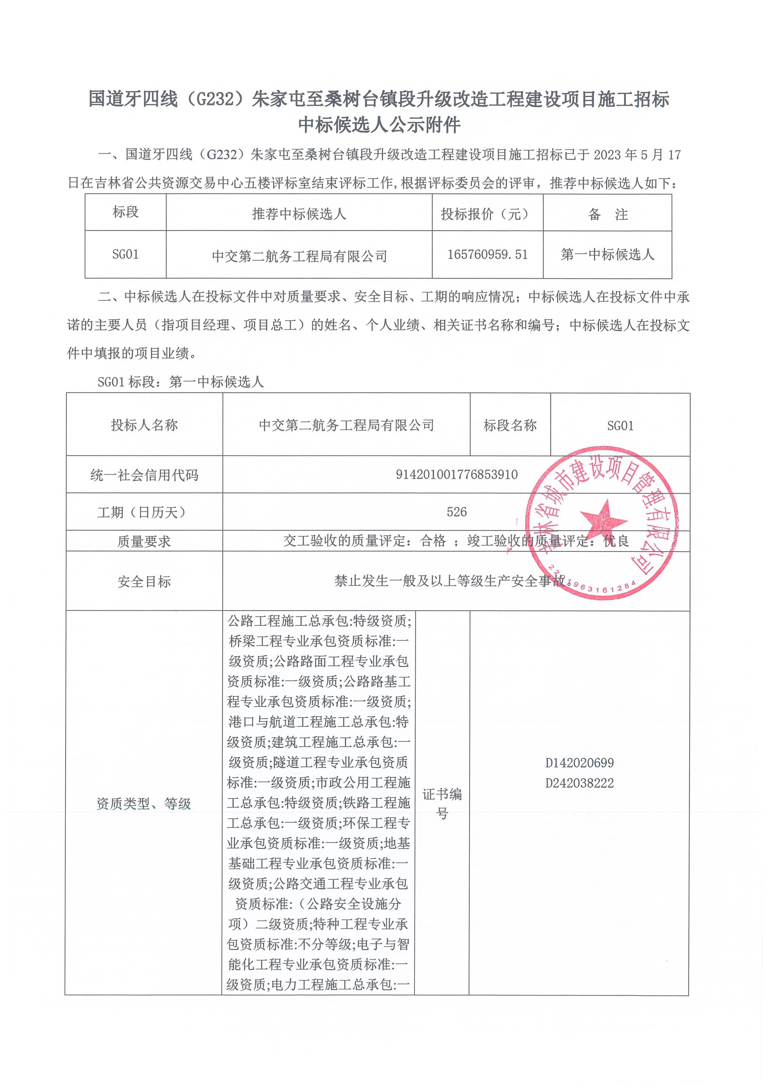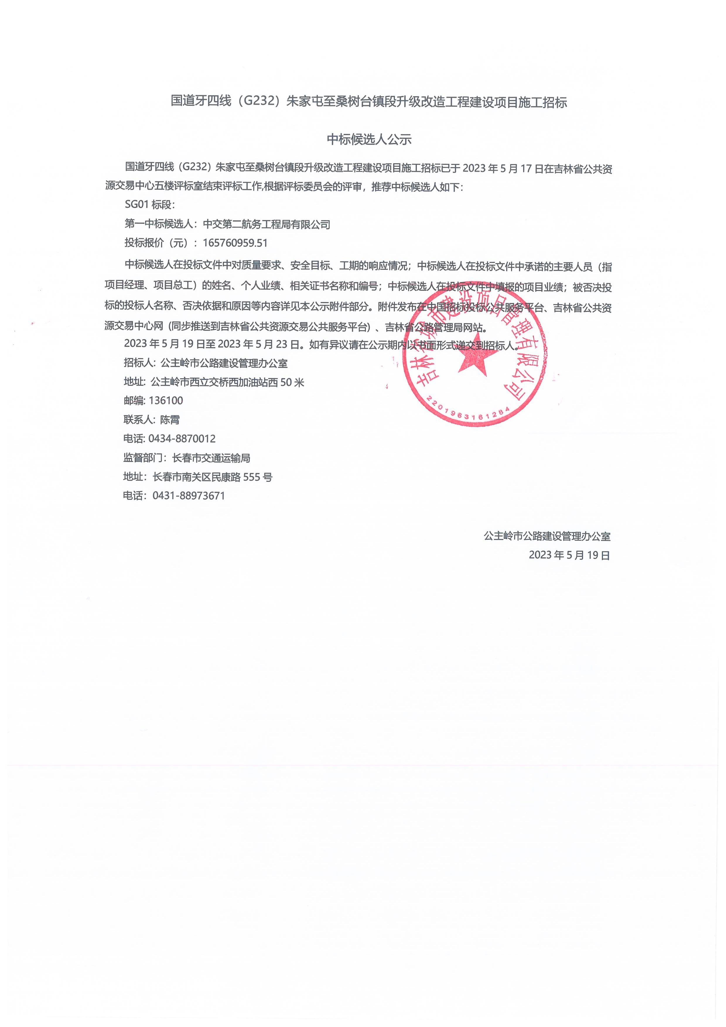 国道牙四线(G232)朱家屯至桑树台镇段升级改造工程建设项目施工招标中标候选人公示