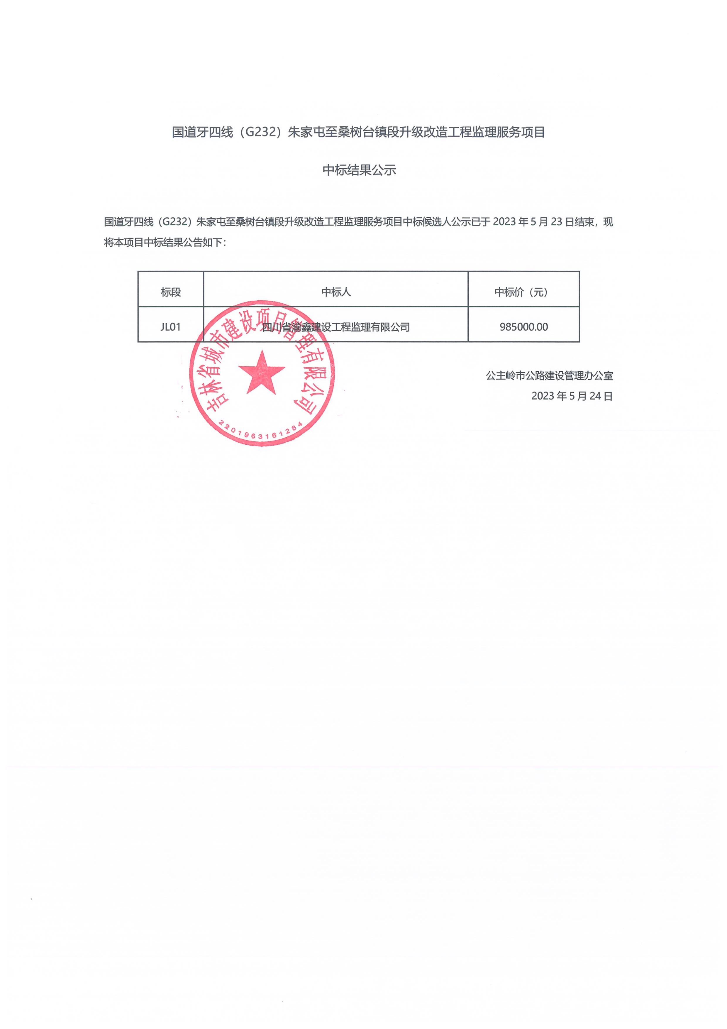 国道牙四线(G232)朱家屯至桑树台镇段升级改造工程监理服务项目中标结果公示