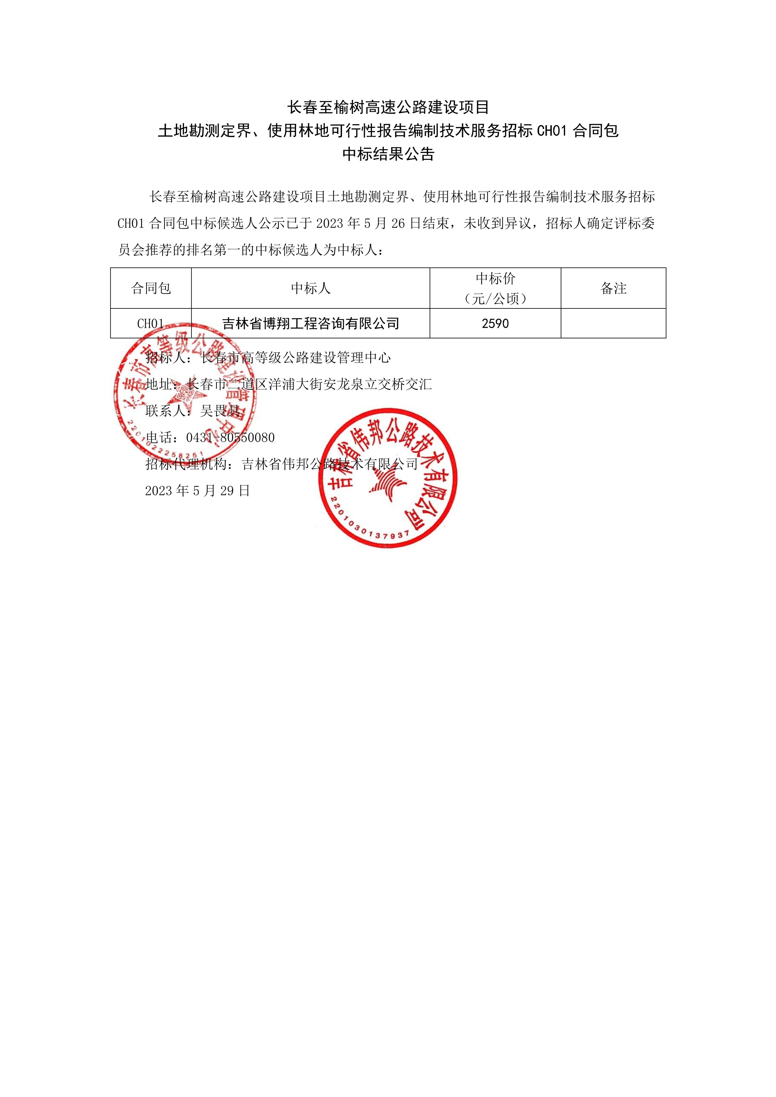 长春至榆树高速公路建设项目土地勘测定界、使用林地可行性报告编制技术服务招标CH01合同包中标结果公告.pdf