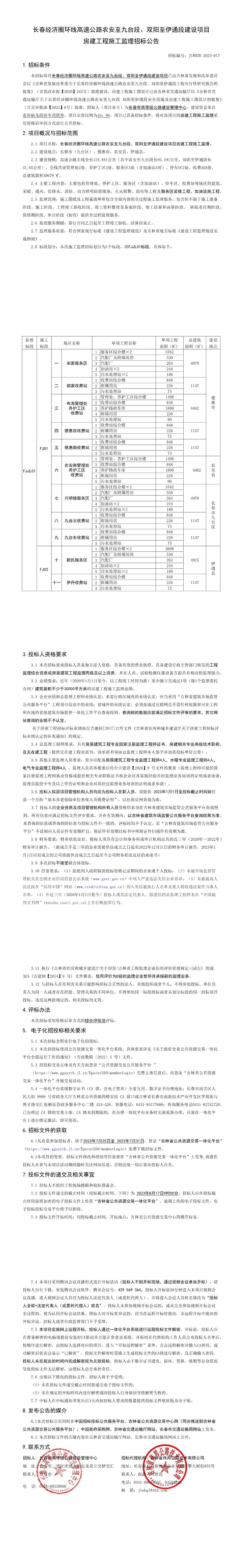 长春经济圈环线高速公路农安至九台段、双阳至伊通段建设项目房建工程施工监理招标公告