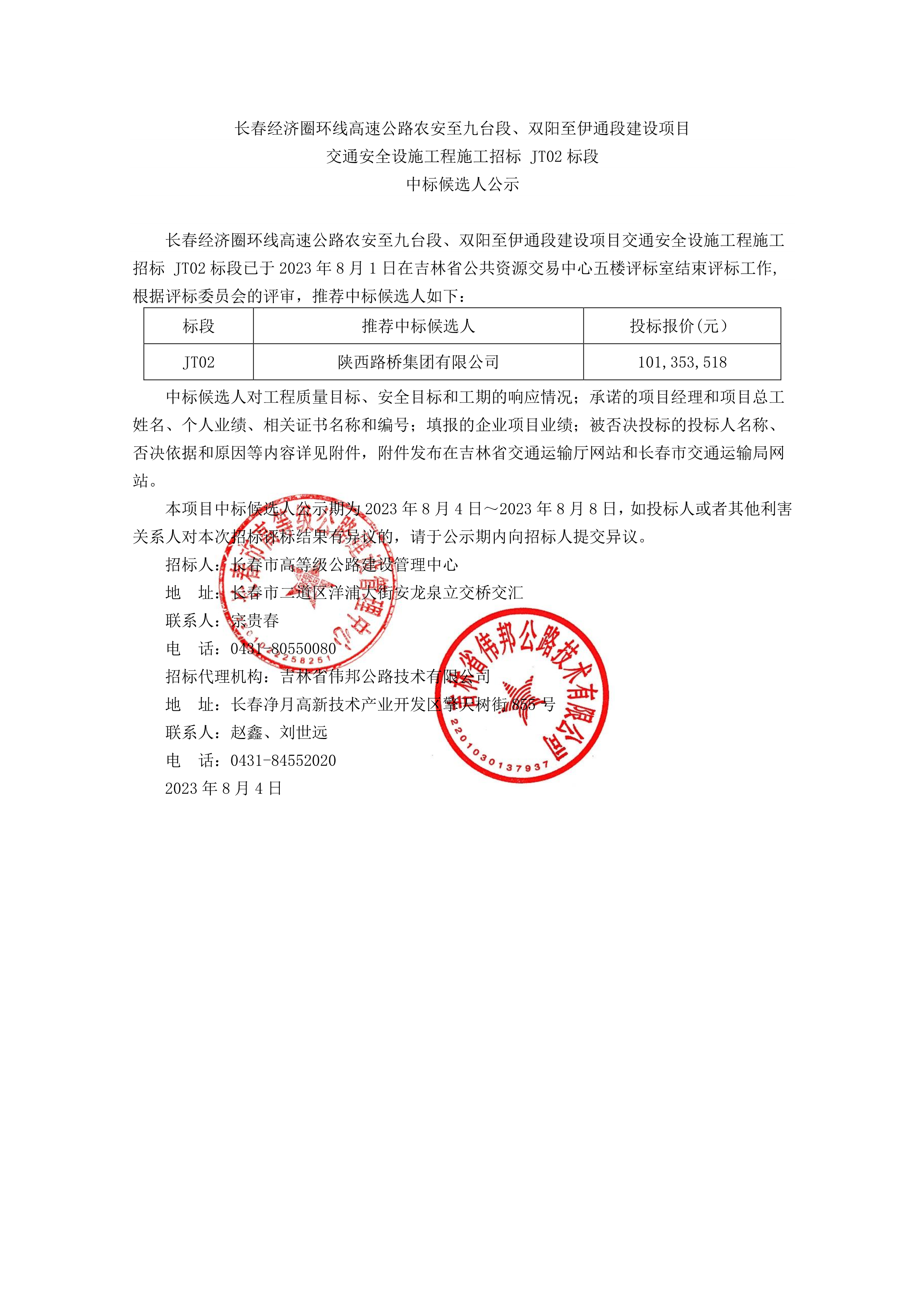 长春经济圈环线高速公路农安至九台段、双阳至伊通段建设项目交通安全设施工程施工招标JT02标段中标候选人公示