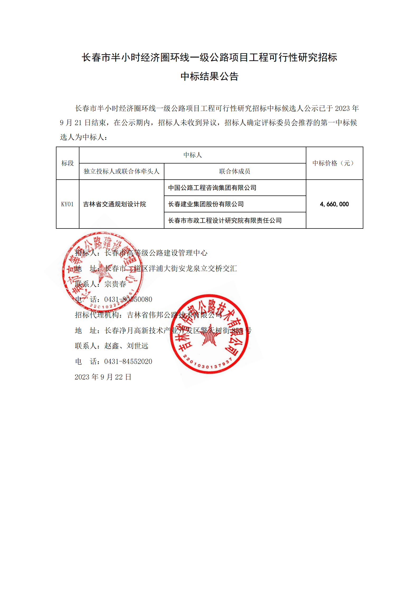 长春市半小时经济圈环线一级公路项目工程可行性研究招标中标结果公告