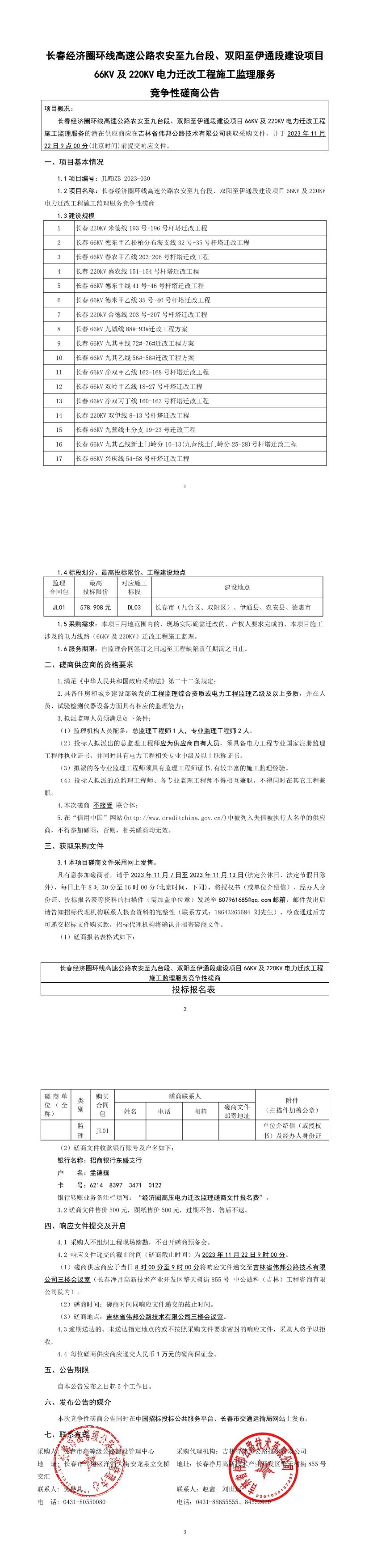 长春经济圈环线高速公路农安至九台段、双阳至伊通段66KV、220KV电力迁改工程施工监理服务竞争性磋商公告
