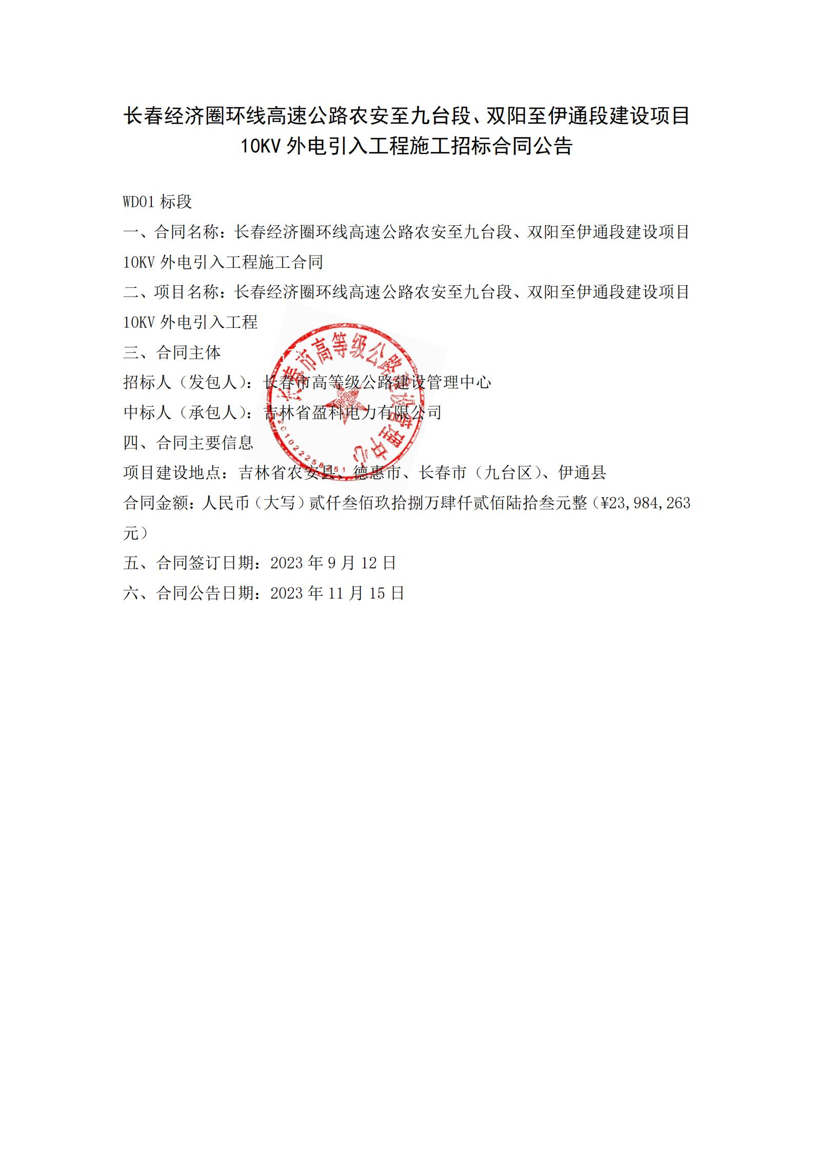 长春经济圈环线高速公路农安至九台段、双阳至伊通段建设项目10KV外电引入工程施工招标合同公告