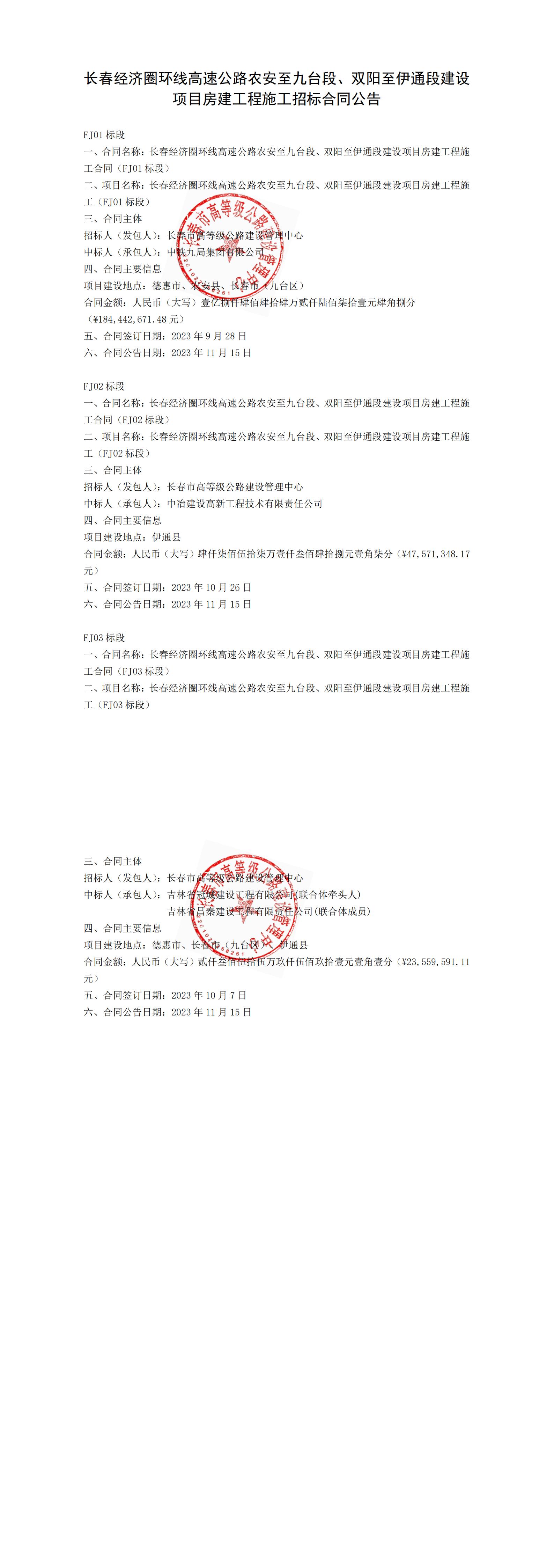 长春经济圈环线高速公路农安至九台段、双阳至伊通段建设项目房建工程施工招标合同公告