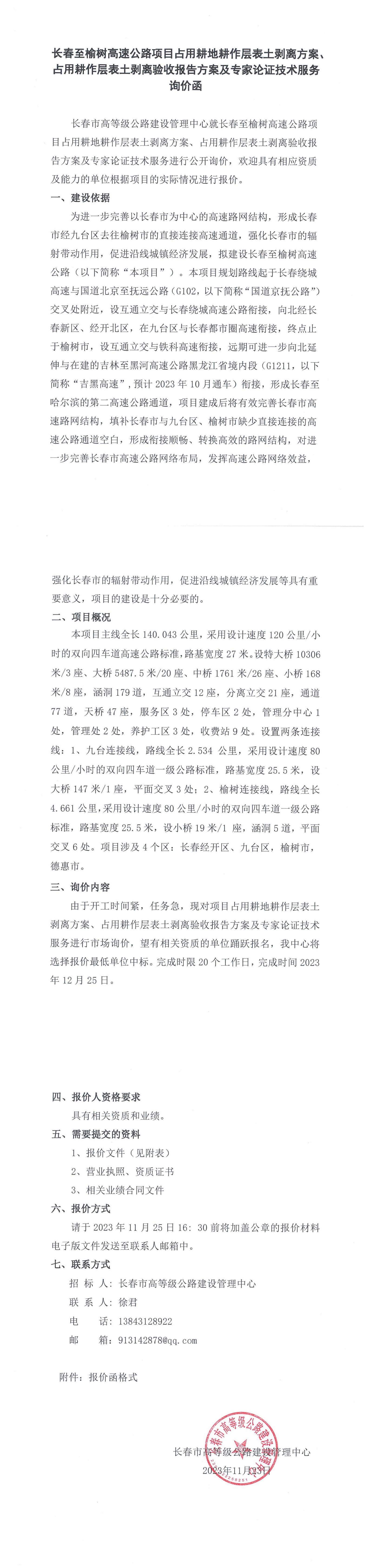 长春至榆树高速公路项目占用耕地耕作层表土剥离方案占用耕作层表土剥离验收报告方案及专家论证技术服务询价函