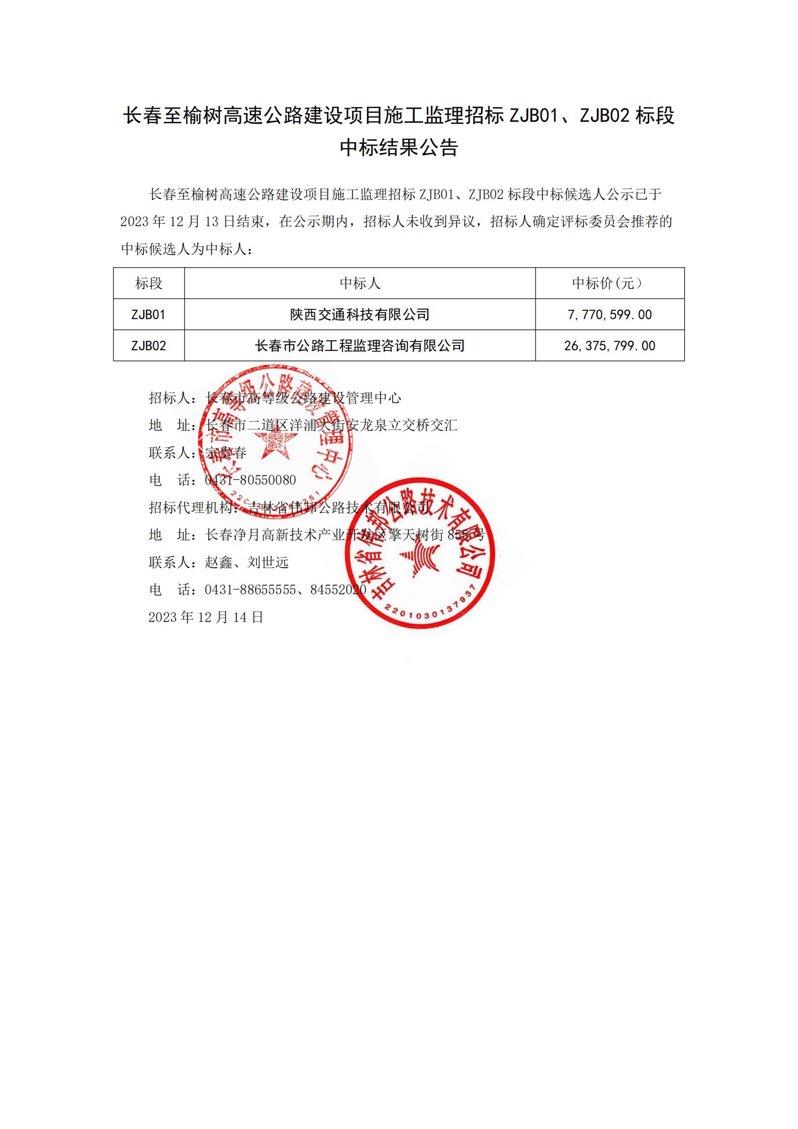 长春至榆树高速公路建设项目施工监理招标ZJB01、ZJB02标段中标结果公告