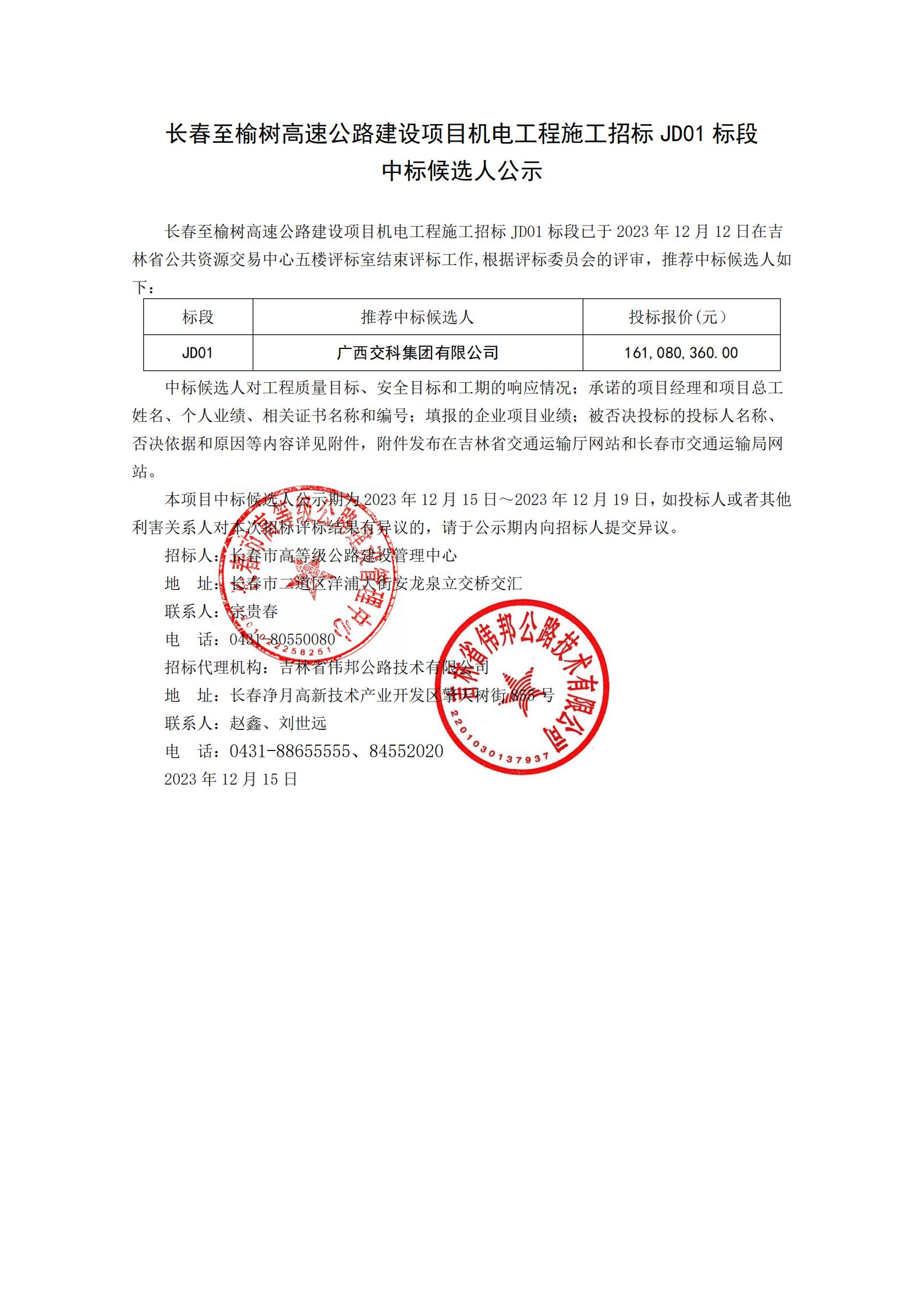 长春至榆树高速公路建设项目机电工程施工招标JD01标段中标候选人公示(附件内容).pdf