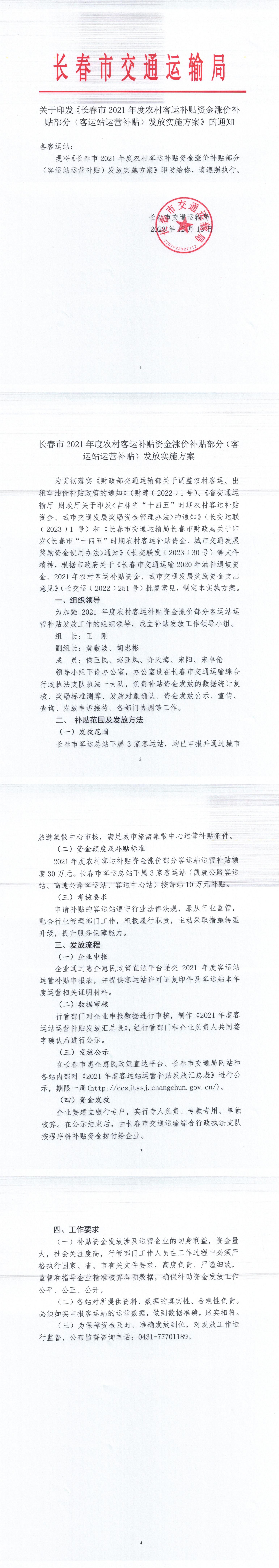 关于印发《长春市 2021 年度农村客运补贴资金涨价补贴部分(客运站运营补贴)发放实施方案》的通知