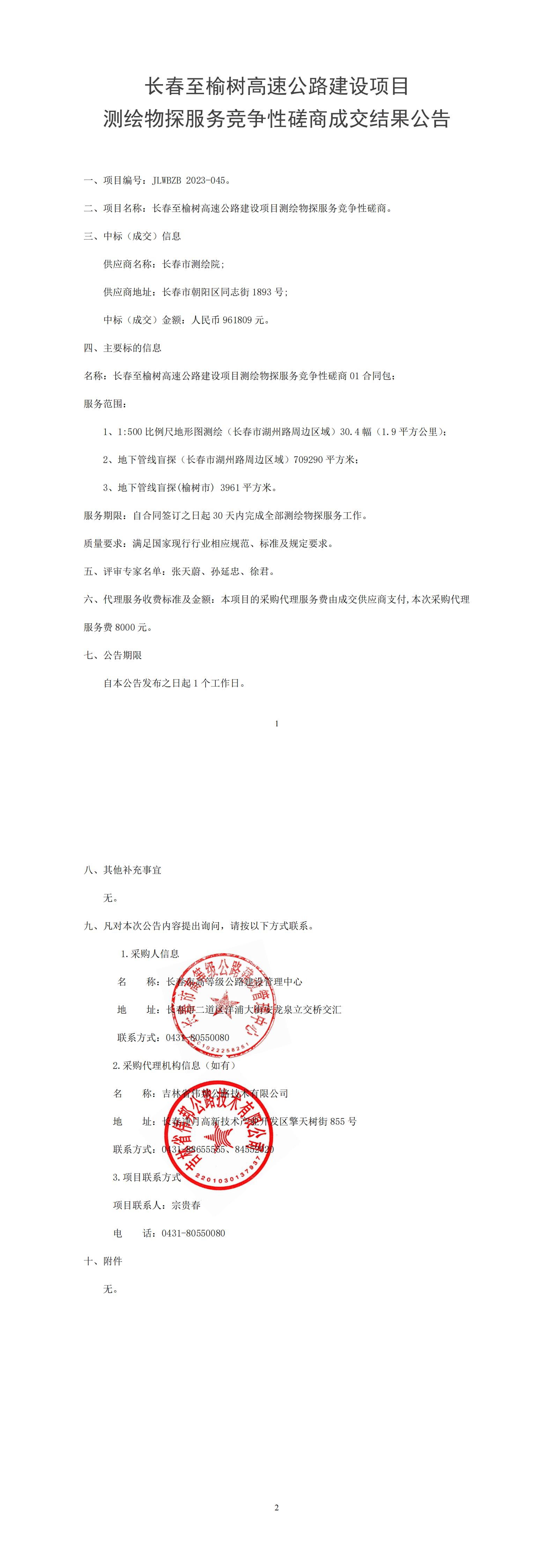 长春至榆树高速公路建设项目测绘物探服务竞争性磋商成交结果公告