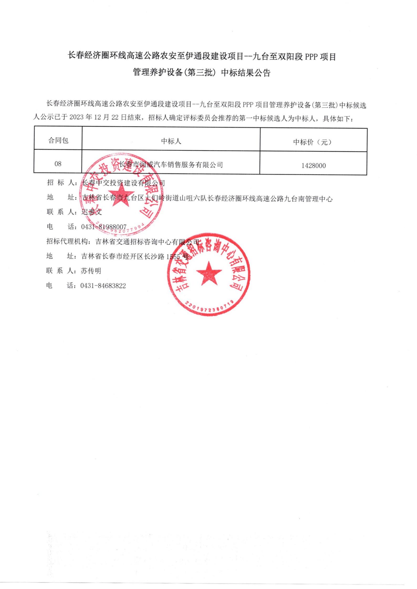 长春经济圈环线高速公路农安至伊通段建设项目--九台至双阳段PPP项目管理养护设备(第三批)中标结果公告