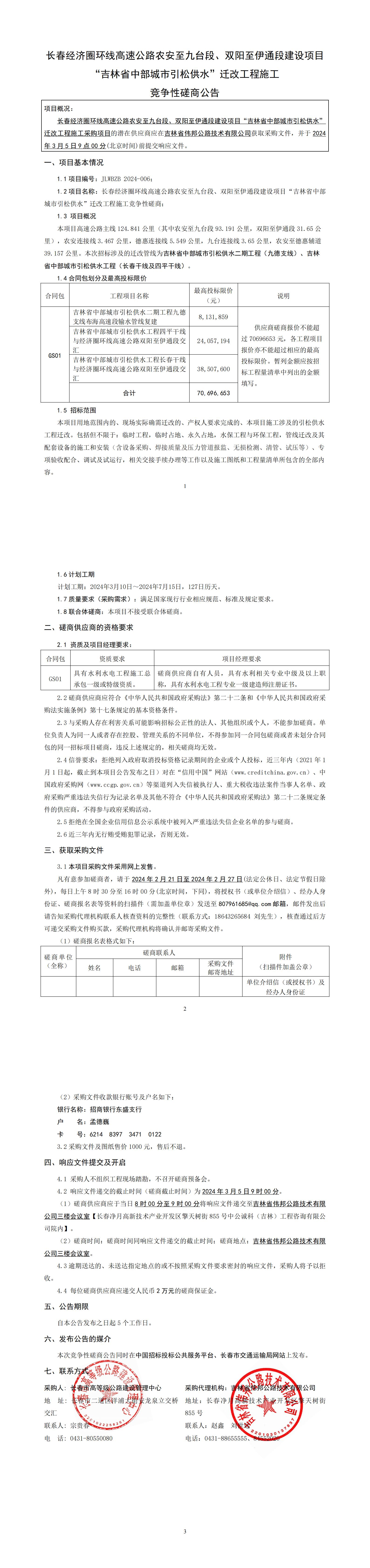 长春经济圈环线高速公路农安至九台段、双阳至伊通段建设项目“吉林省中部城市引松供水”迁改工程施工竞争性磋商公告