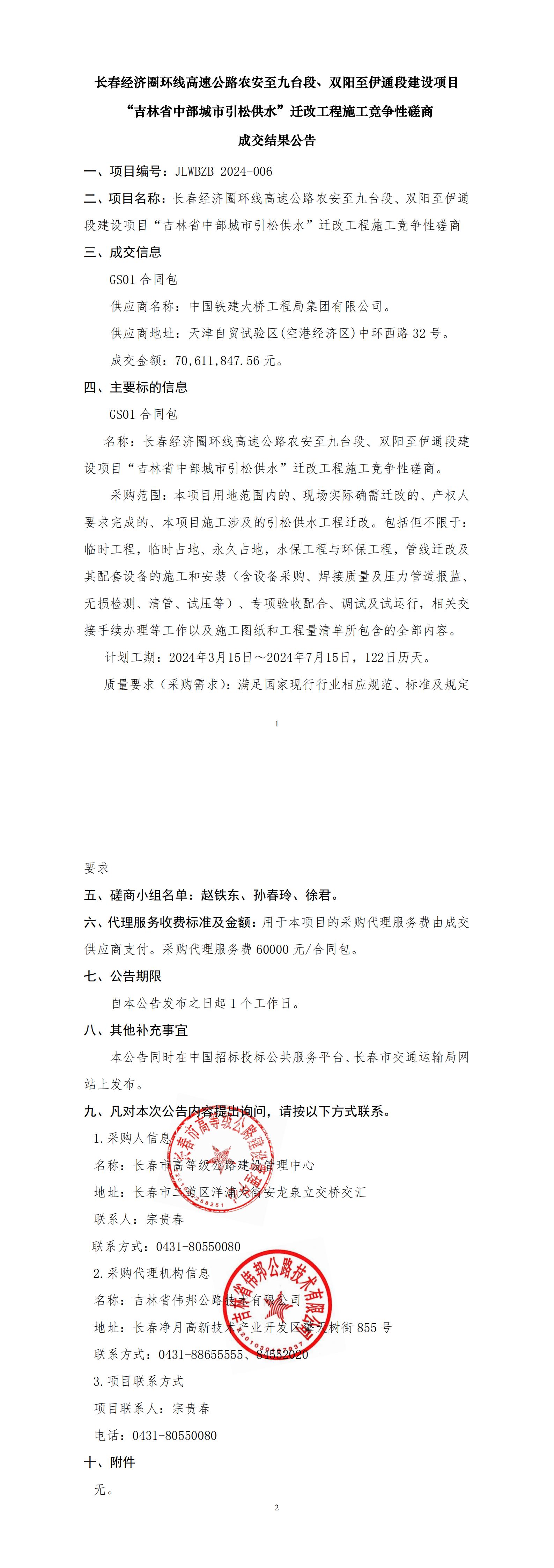 长春经济圈环线高速公路农安至九台段、双阳至伊通段建设项“吉林省中部城市引松供水”迁改工程施工竞争性磋商 成交结果公告