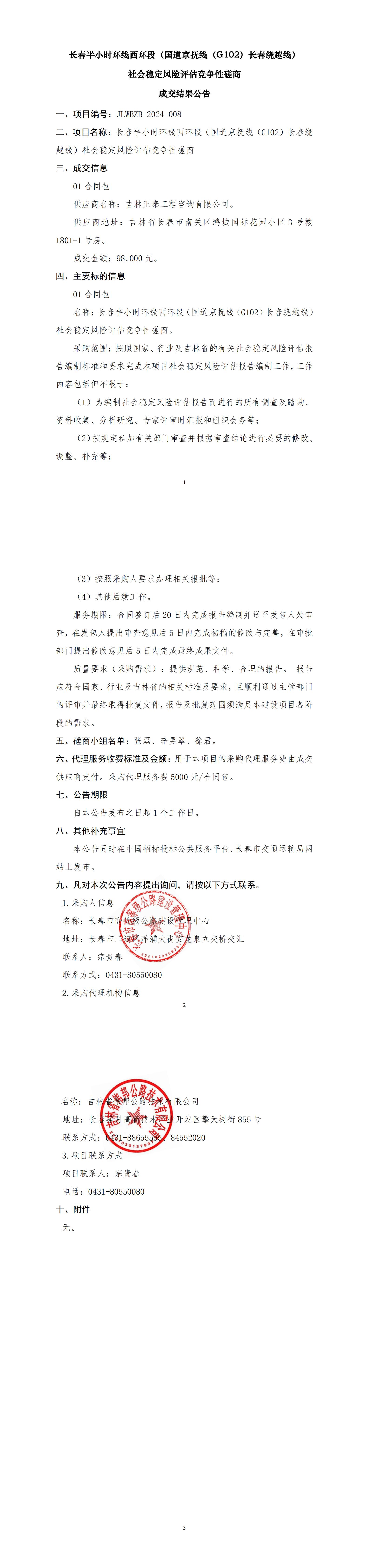 长春半小时环线西环段(国道京抚线(G102)长春绕越线)社会稳定风险评估竞争性磋商成交结果