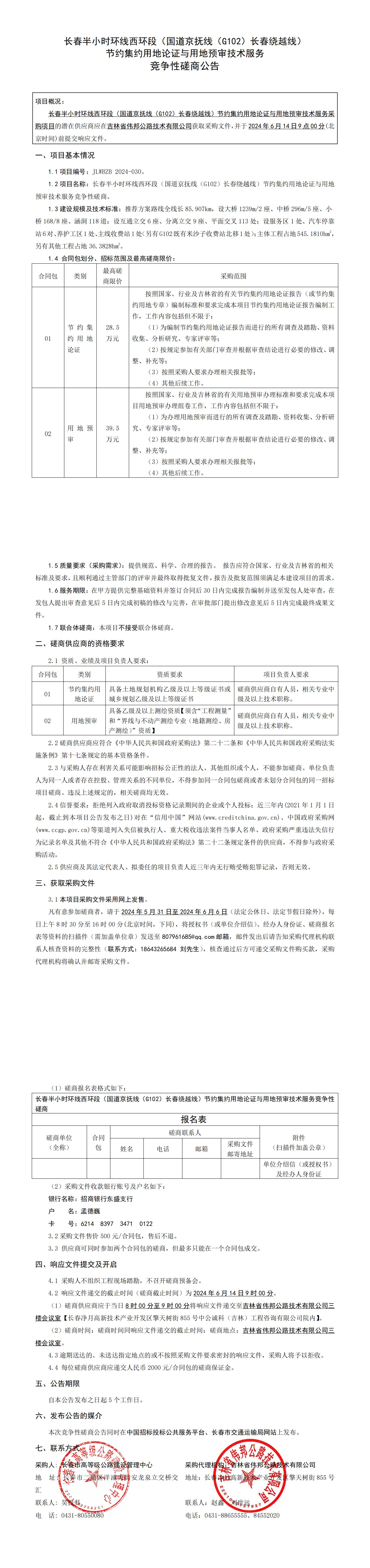 长春半小时环线西环段(国道京抚线(G102)长春绕越线)节约集约用地论证与用地预审技术服务竞争性磋商公告